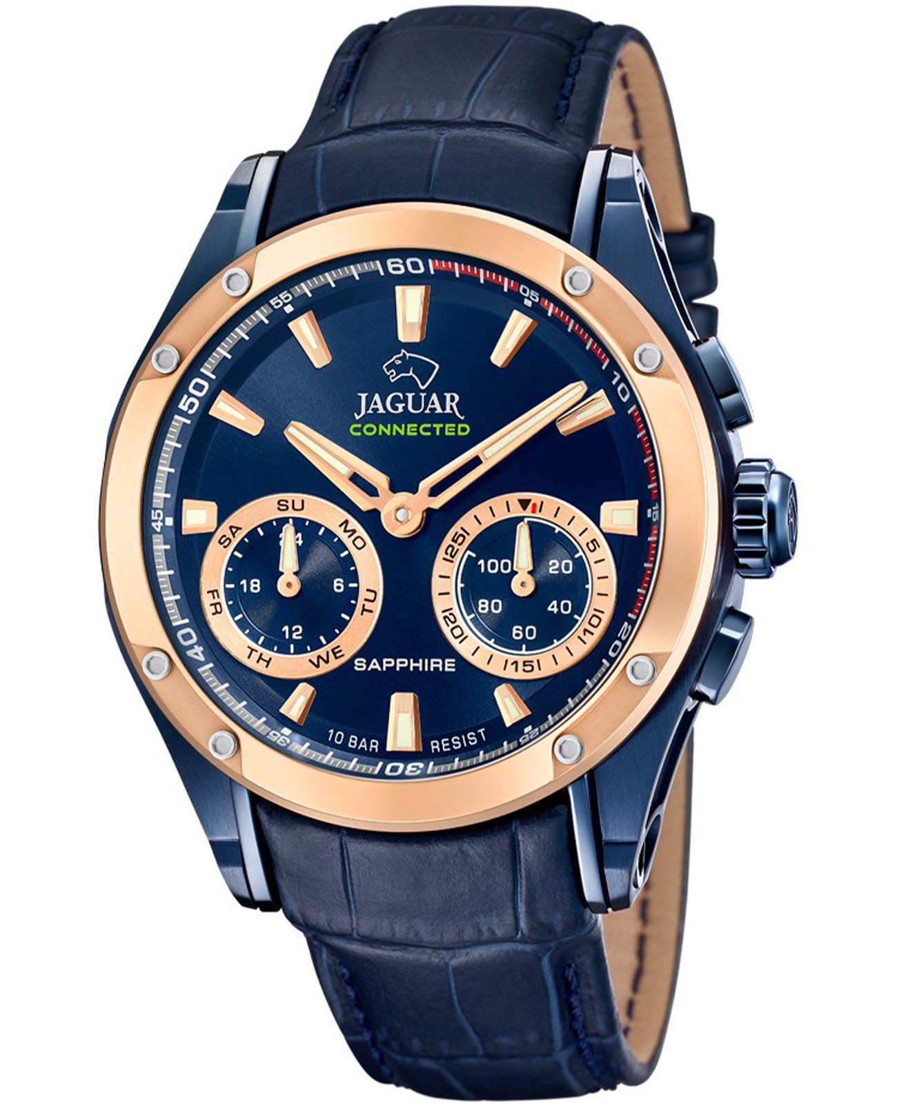 Мужские швейцарские часы Jaguar Connected J960/1. Сапфировое стеклоСапфировое стеклоПрочный и надёжный материал из кристалла сапфира синтетического происхождения, характеризующийся особой твёрдостью и устойчивостью к царапинам и повреждениям. устойчивое к мелким механическим повреждениям. Корпус часов изготовлен из нержавеющей стали с PVD-покрытиемPVDУльтратонкое покрытие наносится в технике вакуумного напыления, сочетает в себе нитрид титана особой прочности со слоем золота или оксида хрома. Несёт в себе декоративную или защитную функцию.. Стрелки и метки с люминесцентным покрытиемЛюминесцентное покрытиеПозволяет считывать показания времени в темноте. Производители наносят на стрелки, часовые индексы, безель или поверхность циферблата светонакопительный состав, дающий холодное свечение.. Календарь находится в положении 8 часов. Класс водозащиты: 100 метров, позволит плавать, нырять и заниматься другими водными видами спорта. Кожаный ремешок на стандартной застёжке. БезельБезельВнешний ободок, закрепляющий стекло. В спортивных часах так называется поворотное кольцо с делениями на циферблате, выполняет роль таймера – замеряет отрезки времени на шкале. Неподвижный безель – элемент декора. Однонаправленно вращающийся безель на дайверских часах позволяет фиксировать моменты погружения и выныривания на поверхность. с PVD-покрытиемPVDУльтратонкое покрытие наносится в технике вакуумного напыления, сочетает в себе нитрид титана особой прочности со слоем золота или оксида хрома. Несёт в себе декоративную или защитную функцию.. За точный ход работы часов, из коллекции Connected, отвечает кварцевый гибридный механизм швейцарского производства со Смарт-Модулем. Данный тип механизма обеспечивает возможность подключить часы к телефону через Bluetooth и управлять большим рядом дополнительных функций на выбор с помошью приложения Jaguar. Дополнительные функции: отображение даты и дня недели, секундомер, таймер, GMT, шагомер, поиск телефона, включение/выключение звука телефона при входящих вызовах, переключение музыки, вибро-уведомления.