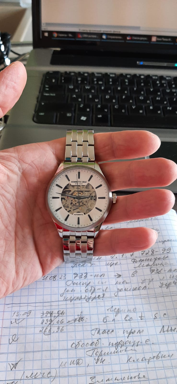 Мужские механические часы-скелетоны с минеральным стекломМинеральное стеклоМинеральное стекло представляет собой искусственно выращенный минерал кварца. Такое стекло отличается особой устойчивостью к повреждениям и царапинам. Уступает по некоторым качествам сапфировому стеклу. Kenneth Cole Automatic KCWGL2216903, механический механизм (автоматический калибр) с высокой точностью. Класс водозащиты: 30 метров, позволит защитить корпус от случайных брызг или капель дождя. Корпус часов изготовлен из стали. Стальной браслет на раскладной застёжкеРаскладная застёжкаТакой тип застёжки используется только на браслетах из металла. Она никогда не раскрывается полностью, происходит разделение на 2 и более частей. Раскладывающая застёжка снизит вероятность потери часов к минимуму.. Стрелки с люминесцентным покрытиемЛюминесцентное покрытиеПозволяет считывать показания времени в темноте. Производители наносят на стрелки, часовые индексы, безель или поверхность циферблата светонакопительный состав, дающий холодное свечение..