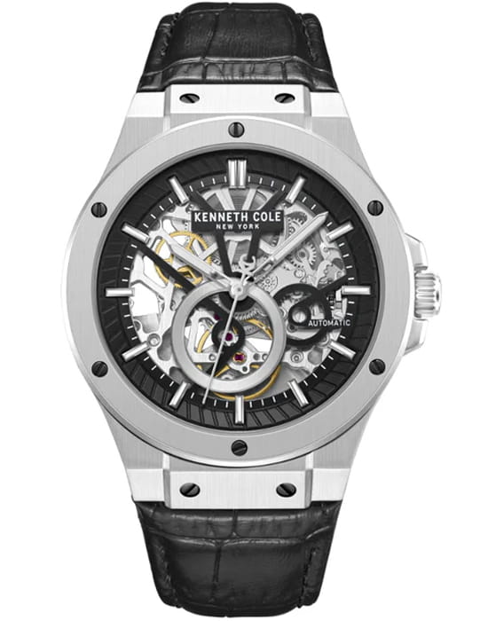 Kenneth Cole KCWGX0080804 — мужская механическая модель с мощным дизайном и открытым скелетонизированным циферблатом. Круглый корпус из нержавеющей стали выполнен и декорирован винтами на безелеБезельВнешний ободок, закрепляющий стекло. В спортивных часах так называется поворотное кольцо с делениями на циферблате, выполняет роль таймера – замеряет отрезки времени на шкале. Неподвижный безель – элемент декора. Однонаправленно вращающийся безель на дайверских часах позволяет фиксировать моменты погружения и выныривания на поверхность., что подчёркивает индустриальный характер часов. Циферблат открывает вид на работу механизма, создавая эффект глубины и технической изысканности. Метки и стрелки покрыты люминесцентным покрытиемЛюминесцентное покрытиеПозволяет считывать показания времени в темноте. Производители наносят на стрелки, часовые индексы, безель или поверхность циферблата светонакопительный состав, дающий холодное свечение., обеспечивающим читаемость даже в условиях слабого освещения. Защитную функцию выполняет минеральное стеклоМинеральное стеклоМинеральное стекло представляет собой искусственно выращенный минерал кварца. Такое стекло отличается особой устойчивостью к повреждениям и царапинам. Уступает по некоторым качествам сапфировому стеклу., стойкое к повседневным повреждениям. Часы комплектуются кожаным ремешком с классической застёжкой, который обеспечивает комфорт и стильное сочетание с массивным корпусом. Модель объединяет выразительный скелетон-дизайн и современный характер, становясь эффектным акцентом в мужском образе.