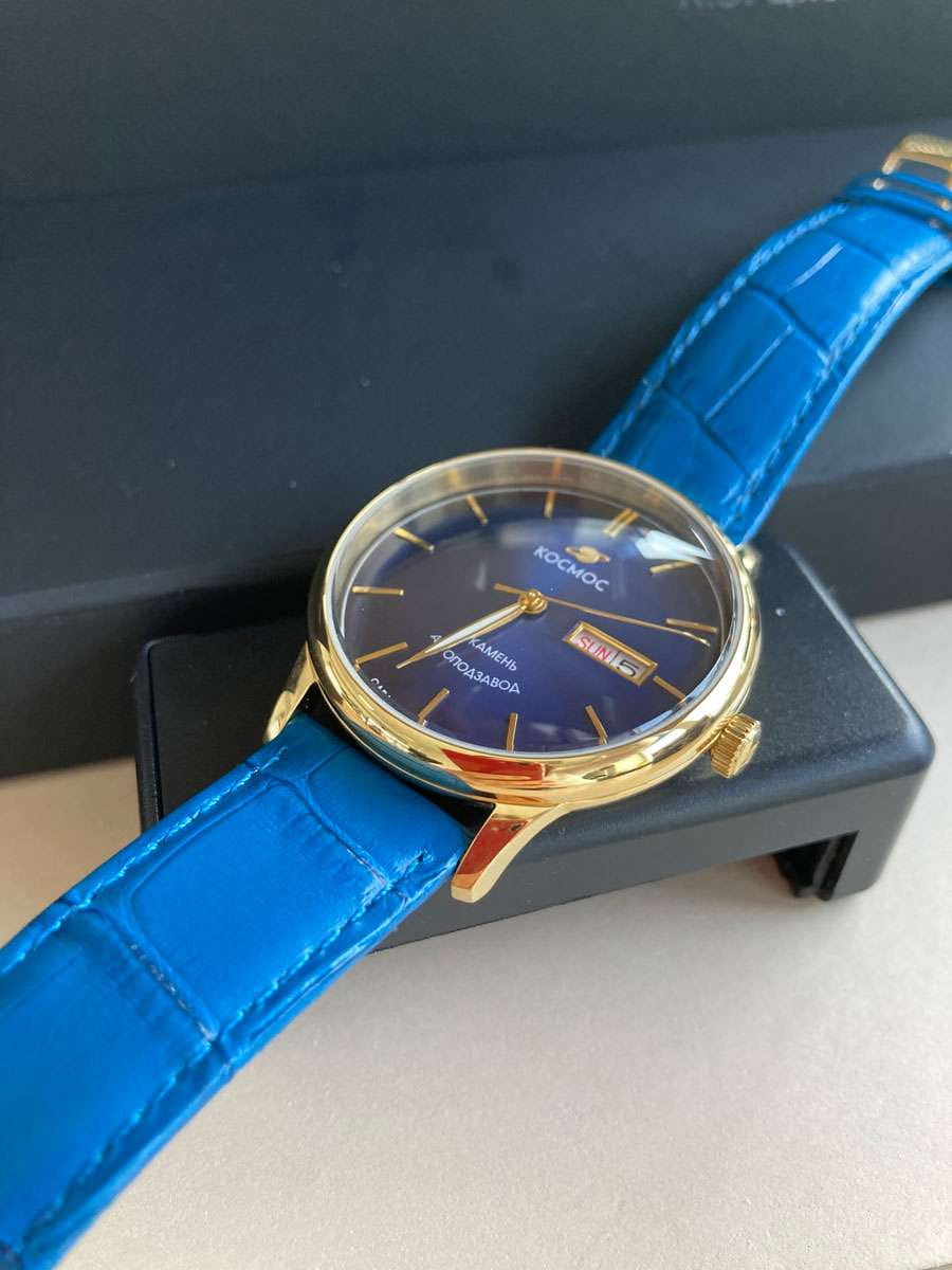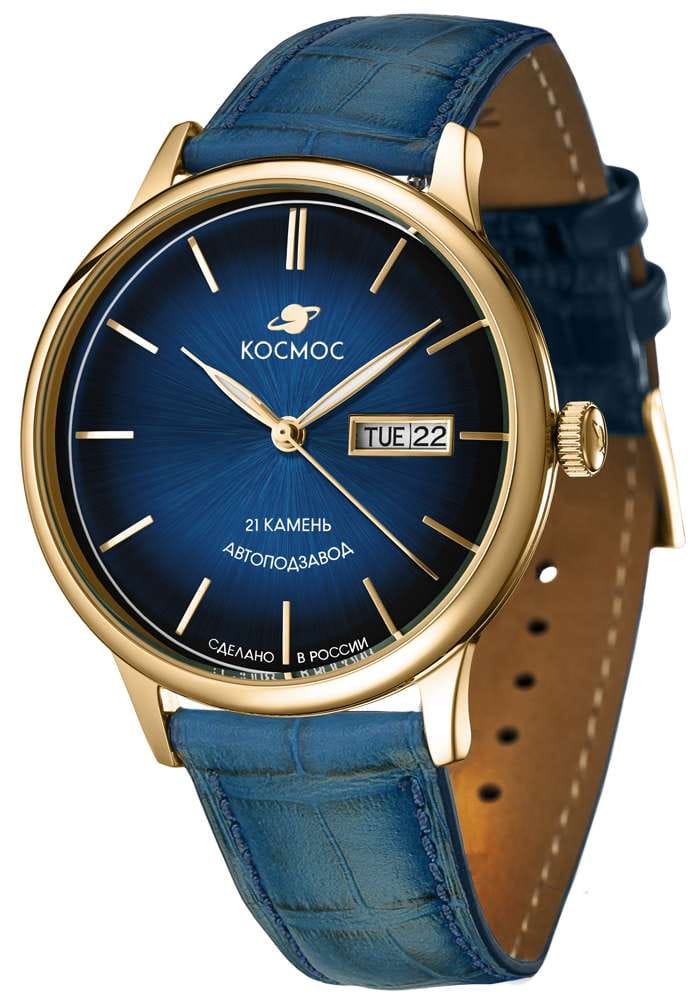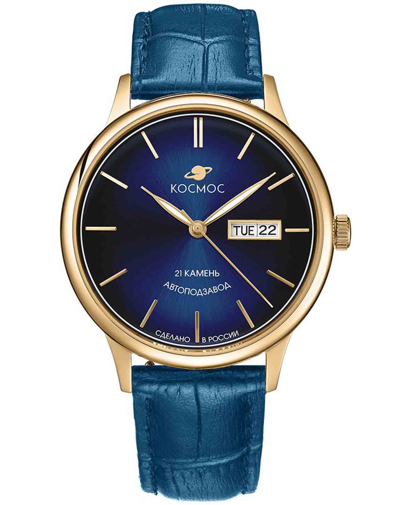 Российские мужские механические часы Космос K 043.26.36 из коллекции Юпитер с автоподзаводом оснащены корпусом из нержавеющей стали 316L с PVD-покрытиемPVDУльтратонкое покрытие наносится в технике вакуумного напыления, сочетает в себе нитрид титана особой прочности со слоем золота или оксида хрома. Несёт в себе декоративную или защитную функцию. диаметром 41 мм и толщиной 14 мм. Циферблат защищен минеральным стекломМинеральное стеклоМинеральное стекло представляет собой искусственно выращенный минерал кварца. Такое стекло отличается особой устойчивостью к повреждениям и царапинам. Уступает по некоторым качествам сапфировому стеклу., выпуклым с обеих сторон. Синий циферблат дополнен функциями отображения даты и дня недели. Прозрачная задняя крышка позволяет наблюдать за работой механизма. Заводная головка украшена логотипом бренда в виде стилизованного изображения планеты. Часы имеют водонепроницаемость 50 метров, позволит защитить корпус от случайных брызг или капель дождя. Модель комплектуется кожаным ремешком на стандартной застежке. Специальные крепежи позволяют легко заменить браслет на часах самостоятельно. Прочный корпус и надежный механизм делают эти часы универсальным аксессуаром для повседневного использования. Уникальный дизайн и высокое качество материалов подчеркивают индивидуальность владельца.
