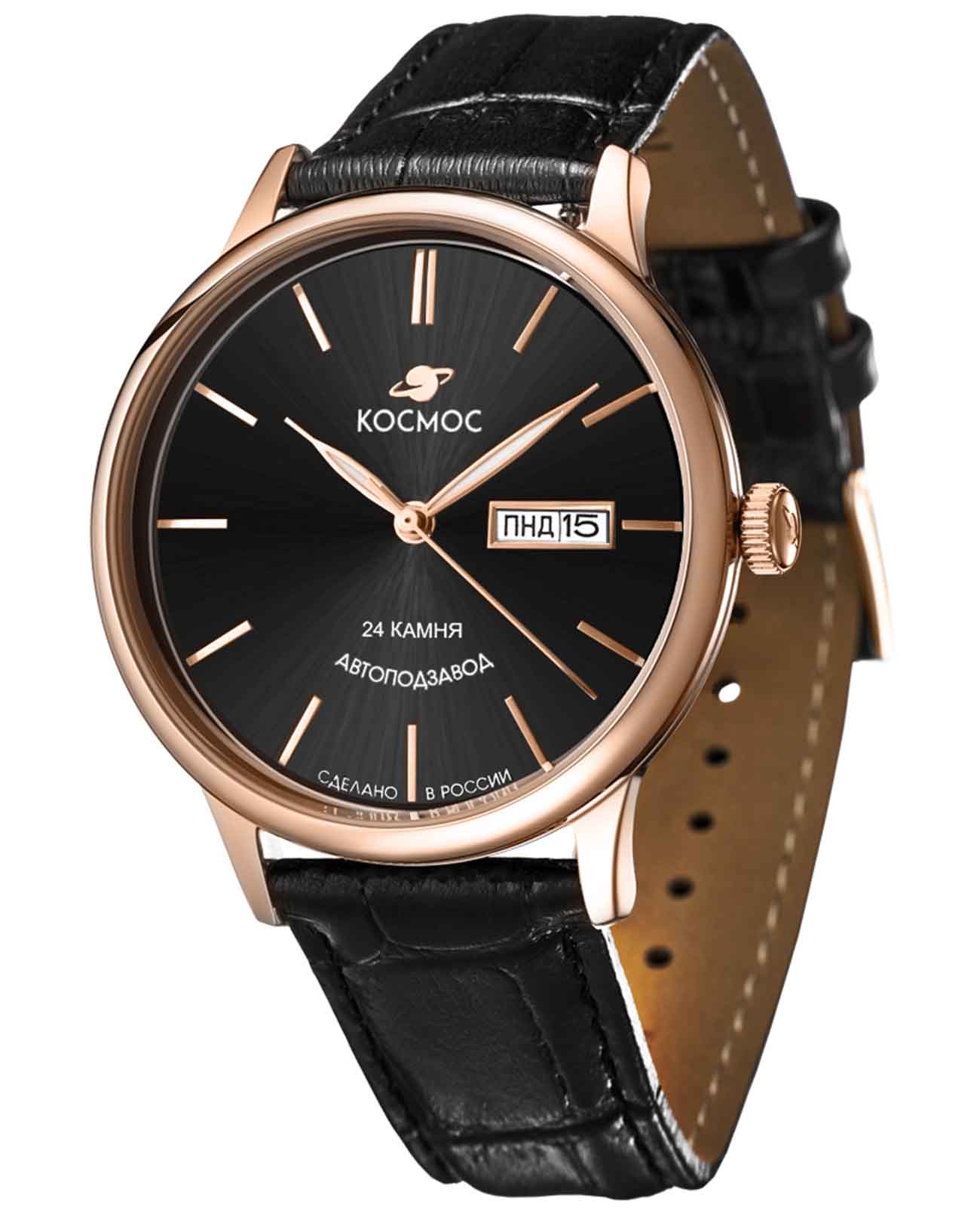 Российские мужские механические часы Космос K 043.41.31 из коллекции Юпитер с автоподзаводом оснащены корпусом из нержавеющей стали 316L с PVD-покрытиемPVDУльтратонкое покрытие наносится в технике вакуумного напыления, сочетает в себе нитрид титана особой прочности со слоем золота или оксида хрома. Несёт в себе декоративную или защитную функцию. диаметром 41 мм и толщиной 14 мм. Циферблат защищен минеральным стекломМинеральное стеклоМинеральное стекло представляет собой искусственно выращенный минерал кварца. Такое стекло отличается особой устойчивостью к повреждениям и царапинам. Уступает по некоторым качествам сапфировому стеклу., выпуклым с обеих сторон. Циферблат дополнен функциями отображения даты и дня недели. Прозрачная задняя крышка позволяет наблюдать за работой механизма. Заводная головка украшена логотипом бренда в виде стилизованного изображения планеты. Часы имеют водонепроницаемость 50 метров, позволит защитить корпус от случайных брызг или капель дождя. Модель комплектуется кожаным ремешком на стандартной застежке. Специальные крепежи позволяют легко заменить браслет на часах самостоятельно. Прочный корпус и надежный механизм делают эти часы универсальным аксессуаром для повседневного использования. Уникальный дизайн и высокое качество материалов подчеркивают индивидуальность владельца.