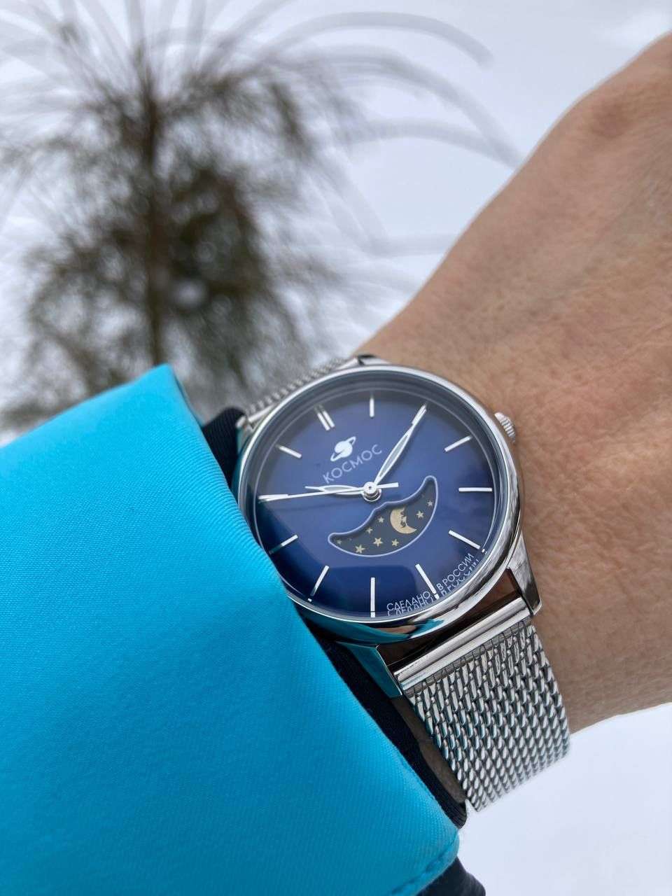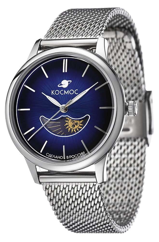 Женские наручные часы Космос Солнце и Луна K 617.10.36 — это сочетание традиций часового искусства 60-70-х годов и футуристического дизайна, вдохновленного космическими исследованиями. Они не только служат напоминанием о прошлом, но и побуждают задуматься о будущем, позволяя наслаждаться качеством и смыслом, вложенными в каждую деталь. Полированный корпус часов выполнен в виде силуэта летающей тарелки благодаря выпуклым формам стекла и нижней части корпуса. Стальные ушки, которые напоминают опоры летающей тарелки, завершает общий образ. На задней крышке часов выгравирован фантазийный сюжет – космическая станция будущего. Элегантные женские часы из серии Солнце и Луна выделяются функцией день/ночь. Циферблат выполнен в ретро-стиле с выгнутыми краями, что требует применения сложных технологий в производстве. Циферблаты такой формы были характерны для часов прошлых эпох. Кончик секундной стрелки изогнут в соответствии с формой циферблата. На градиентном выпуклом циферблате выполнена шлифовка в стиле солнечных лучей, а также размещены индексы, изготовленные вручную и закрепленные на двух штифтах.  Часовая и минутная стрелки, а также круг по краю циферблата, напоминающий ореол Земли, с  люминесцентным покрытиемЛюминесцентное покрытиеПозволяет считывать показания времени в темноте. Производители наносят на стрелки, часовые индексы, безель или поверхность циферблата светонакопительный состав, дающий холодное свечение., которое светится в темноте, создавая завораживающий эффект. Форма минерального стеклаМинеральное стеклоМинеральное стекло представляет собой искусственно выращенный минерал кварца. Такое стекло отличается особой устойчивостью к повреждениям и царапинам. Уступает по некоторым качествам сапфировому стеклу. тщательно продумана: оно выгнуто как снаружи, так и изнутри. Такое решение позволяет избежать искажения изображения на циферблате, в отличие от стекла с прямой внутренней частью, которое создает эффект линзы. Модель оснащена гибким и прочным браслетом миланского плетения. Заводная головка, застежка и ремешок украшены фирменным логотипом.