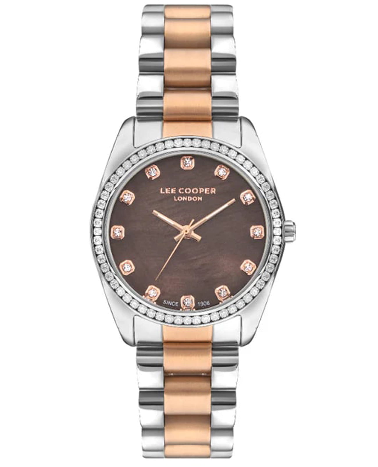 Женские наручные часы Lee Cooper LC07478.540 — это элегантная модель с утончённым дизайном. Корпус диаметром 34 мм выполнен из суперметалла, что придаёт часам изысканный вид. Перламутровый циферблат украшен изящными метками и стрелками, обеспечивая удобное считывание времени. Циферблат защищён минеральным стекломМинеральное стеклоМинеральное стекло представляет собой искусственно выращенный минерал кварца. Такое стекло отличается особой устойчивостью к повреждениям и царапинам. Уступает по некоторым качествам сапфировому стеклу., устойчивым к царапинам. Часы работают на кварцевом механизме, обеспечивая точность хода. Браслет из нержавеющей стали с раскладной застёжкойРаскладная застёжкаТакой тип застёжки используется только на браслетах из металла. Она никогда не раскрывается полностью, происходит разделение на 2 и более частей. Раскладывающая застёжка снизит вероятность потери часов к минимуму. гарантирует комфортное ношение и надёжную фиксацию на запястье. Водозащита WR30 защищает часы от случайных брызг и дождя, делая их подходящими для повседневного использования.