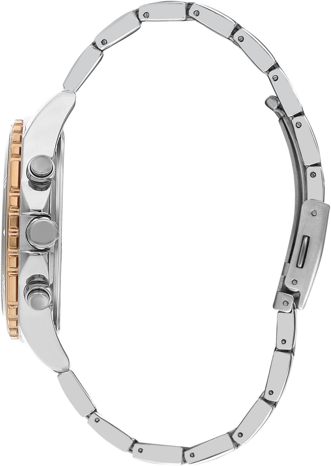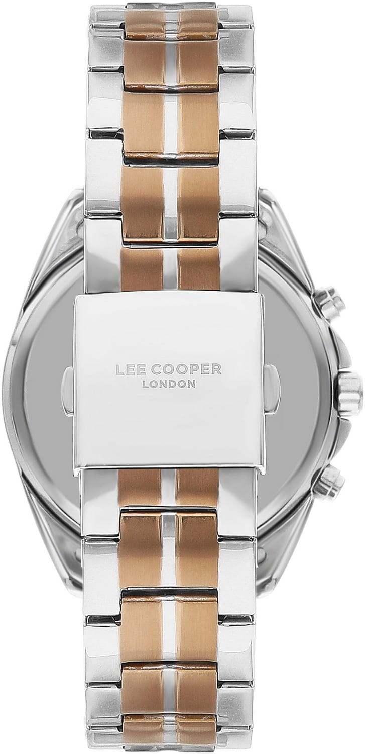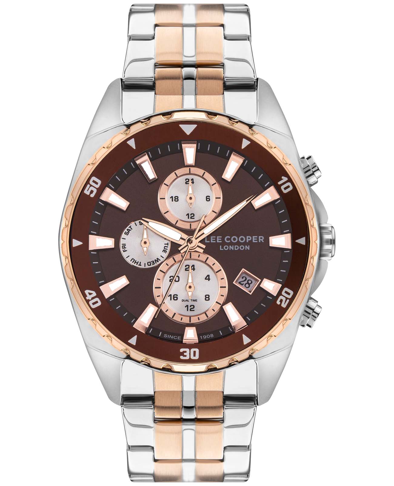 Мужские часы Lee Cooper LC07515.560 — это стильное сочетание элегантности и современного дизайна. Круглый корпус диаметром 44 мм выполнен из суперметалла серебристого цвета. БезельБезельВнешний ободок, закрепляющий стекло. В спортивных часах так называется поворотное кольцо с делениями на циферблате, выполняет роль таймера – замеряет отрезки времени на шкале. Неподвижный безель – элемент декора. Однонаправленно вращающийся безель на дайверских часах позволяет фиксировать моменты погружения и выныривания на поверхность. с IP-покрытиемIP-покрытиеМетод ионного напыления. Демонстрирует повышенную устойчивость к истиранию, окислению и химическим веществам. Под воздействием высокого давления и температуры около 1500°C молекулы металла надёжно соединяются с частицами корпуса часов. придает модели особый вид. Циферблат защищен минеральным стекломМинеральное стеклоМинеральное стекло представляет собой искусственно выращенный минерал кварца. Такое стекло отличается особой устойчивостью к повреждениям и царапинам. Уступает по некоторым качествам сапфировому стеклу., обеспечивающим устойчивость к царапинам. Метки в виде штрихов. Часы оснащены надежным кварцевым механизмом, а металлический браслет на раскладной застёжкеРаскладная застёжкаТакой тип застёжки используется только на браслетах из металла. Она никогда не раскрывается полностью, происходит разделение на 2 и более частей. Раскладывающая застёжка снизит вероятность потери часов к минимуму. с частичным IP-покрытиемIP-покрытиеМетод ионного напыления. Демонстрирует повышенную устойчивость к истиранию, окислению и химическим веществам. Под воздействием высокого давления и температуры около 1500°C молекулы металла надёжно соединяются с частицами корпуса часов. гарантирует комфортную посадку на запястье. Окошко даты находится в положении между 4 и 5 часов. Стрелки и метки с люминесцентным покрытиемЛюминесцентное покрытиеПозволяет считывать показания времени в темноте. Производители наносят на стрелки, часовые индексы, безель или поверхность циферблата светонакопительный состав, дающий холодное свечение. позволяют легко считывать время даже в условиях недостаточного освещения. Мультифункциональная модель с индикацией даты, дня недели, с дополнительным 24-х часовым индикатором. Водозащита 50 метров позволит защитить корпус от случайных брызг или капель дождя. Lee Cooper  — отличный выбор для тех, кто ценит утонченность и качество.