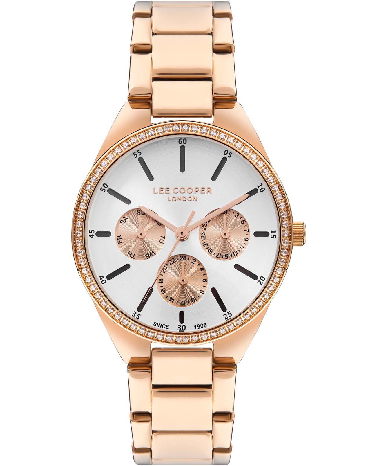 Женские часы Lee Cooper LC07863.430 — это стильное сочетание элегантности и современного дизайна. Круглый корпус диаметром 34 мм выполнен из суперметалла с IP-покрытиемIP-покрытиеМетод ионного напыления. Демонстрирует повышенную устойчивость к истиранию, окислению и химическим веществам. Под воздействием высокого давления и температуры около 1500°C молекулы металла надёжно соединяются с частицами корпуса часов. золотого цвета, а неподвижный безельБезельВнешний ободок, закрепляющий стекло. В спортивных часах так называется поворотное кольцо с делениями на циферблате, выполняет роль таймера – замеряет отрезки времени на шкале. Неподвижный безель – элемент декора. Однонаправленно вращающийся безель на дайверских часах позволяет фиксировать моменты погружения и выныривания на поверхность. украшен цирконами, придающими модели особый блеск. Серебристый циферблат защищен минеральным стекломМинеральное стеклоМинеральное стекло представляет собой искусственно выращенный минерал кварца. Такое стекло отличается особой устойчивостью к повреждениям и царапинам. Уступает по некоторым качествам сапфировому стеклу., обеспечивающим устойчивость к царапинам. Метки в виде штрихов. Часы оснащены надежным кварцевым механизмом, а металлический браслет с IP-покрытиемIP-покрытиеМетод ионного напыления. Демонстрирует повышенную устойчивость к истиранию, окислению и химическим веществам. Под воздействием высокого давления и температуры около 1500°C молекулы металла надёжно соединяются с частицами корпуса часов. на раскладной застёжкеРаскладная застёжкаТакой тип застёжки используется только на браслетах из металла. Она никогда не раскрывается полностью, происходит разделение на 2 и более частей. Раскладывающая застёжка снизит вероятность потери часов к минимуму. гарантирует комфортную посадку на запястье. Мультифункциональная модель с индикацией даты, дня недели, с дополнительным 24-х часовым индикатором. Водозащита 30 метров защищает модель от случайных брызг и дождя. Lee Cooper — отличный выбор для тех, кто ценит утонченность и качество.