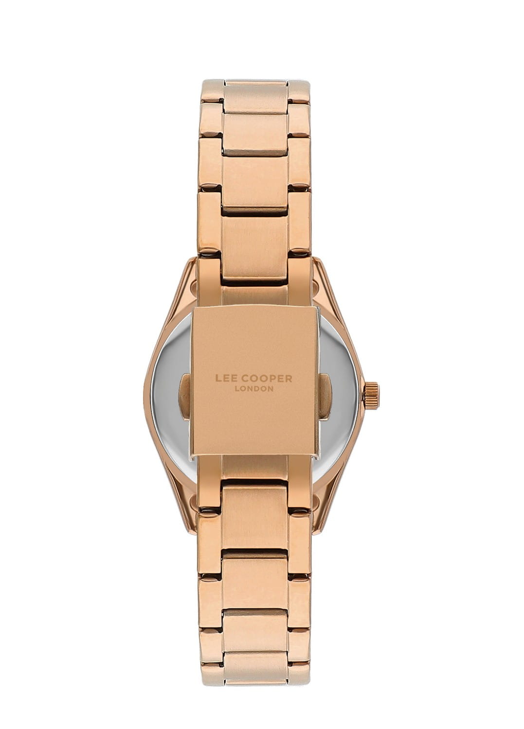 Женские часы Lee Cooper LC07868.420 выполнены в классическом стиле и сочетают строгий дизайн с надёжным механизмом. Модель оснащена кварцевым механизмом, обеспечивающим точность хода и минимальное обслуживание. Изящный корпус изготовлен из суперметалла с IP-покрытиемIP-покрытиеМетод ионного напыления. Демонстрирует повышенную устойчивость к истиранию, окислению и химическим веществам. Под воздействием высокого давления и температуры около 1500°C молекулы металла надёжно соединяются с частицами корпуса часов., гарантирует комфорт при ношении. Изысканный циферблат дополнен штрихами и римскими цифрами для чёткого отсчёта времени. Защиту циферблата обеспечивает минеральное стеклоМинеральное стеклоМинеральное стекло представляет собой искусственно выращенный минерал кварца. Такое стекло отличается особой устойчивостью к повреждениям и царапинам. Уступает по некоторым качествам сапфировому стеклу., устойчивое к мелким механическим повреждениям. Стальной браслет с IP-покрытиемIP-покрытиеМетод ионного напыления. Демонстрирует повышенную устойчивость к истиранию, окислению и химическим веществам. Под воздействием высокого давления и температуры около 1500°C молекулы металла надёжно соединяются с частицами корпуса часов. на раскладной застёжкеРаскладная застёжкаТакой тип застёжки используется только на браслетах из металла. Она никогда не раскрывается полностью, происходит разделение на 2 и более частей. Раскладывающая застёжка снизит вероятность потери часов к минимуму. гарантирует удобную посадку и надёжную фиксацию на запястье. Метки с люминесцентным покрытиемЛюминесцентное покрытиеПозволяет считывать показания времени в темноте. Производители наносят на стрелки, часовые индексы, безель или поверхность циферблата светонакопительный состав, дающий холодное свечение., обеспечивающим хорошую читаемость в темноте. Водозащита 30WR позволяет использовать часы в повседневных условиях без риска повреждения от случайных брызг воды. Это сочетание классического дизайна, прочности материалов и качества исполнения для уверенных в себе женщин.