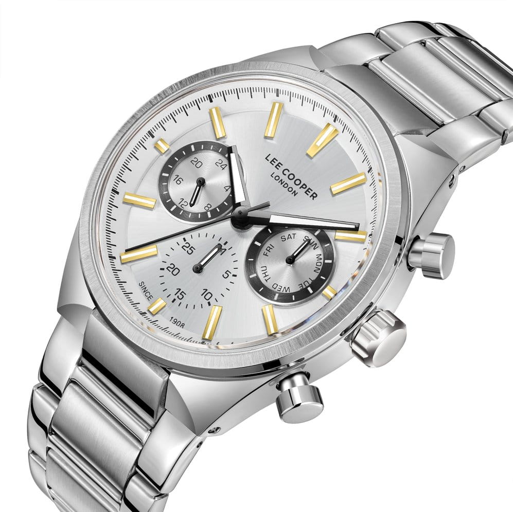 Мужские наручные часы Lee Cooper LC08174.330 оснащены кварцевым механизмом, обеспечивающий высокую точность хода и надежность. Элегантный корпус часов выполнен из суперметалла серебристого цвета, что делает их устойчивыми к внешним воздействиям и придает благородный вид. Циферблат украшен классическими стрелками и метками с люминесцентным покрытиемЛюминесцентное покрытиеПозволяет считывать показания времени в темноте. Производители наносят на стрелки, часовые индексы, безель или поверхность циферблата светонакопительный состав, дающий холодное свечение., гармонично дополняющим общий дизайн модели. Для защиты циферблата используется минеральное стеклоМинеральное стеклоМинеральное стекло представляет собой искусственно выращенный минерал кварца. Такое стекло отличается особой устойчивостью к повреждениям и царапинам. Уступает по некоторым качествам сапфировому стеклу., устойчивое к царапинам и механическим повреждениям. Корпус имеет круглую форму диаметром 42 мм, что делает часы заметными и подходящими. Браслет из стали оснащен раскладной застёжкойРаскладная застёжкаТакой тип застёжки используется только на браслетах из металла. Она никогда не раскрывается полностью, происходит разделение на 2 и более частей. Раскладывающая застёжка снизит вероятность потери часов к минимуму., обеспечивающим комфортное и безопасное ношение. Вынесенный циферблат с 24-х часовым указателем времени, индикацией даты и дня недели. Часы обладают водонепроницаемостью до 50 метров (5 АТМ), что позволяет использовать их в повседневной жизни, включая контакт с водой при мытье рук или дожде. Эти часы станут идеальным выбором для мужчин, ценящих стиль, качество и функциональность.