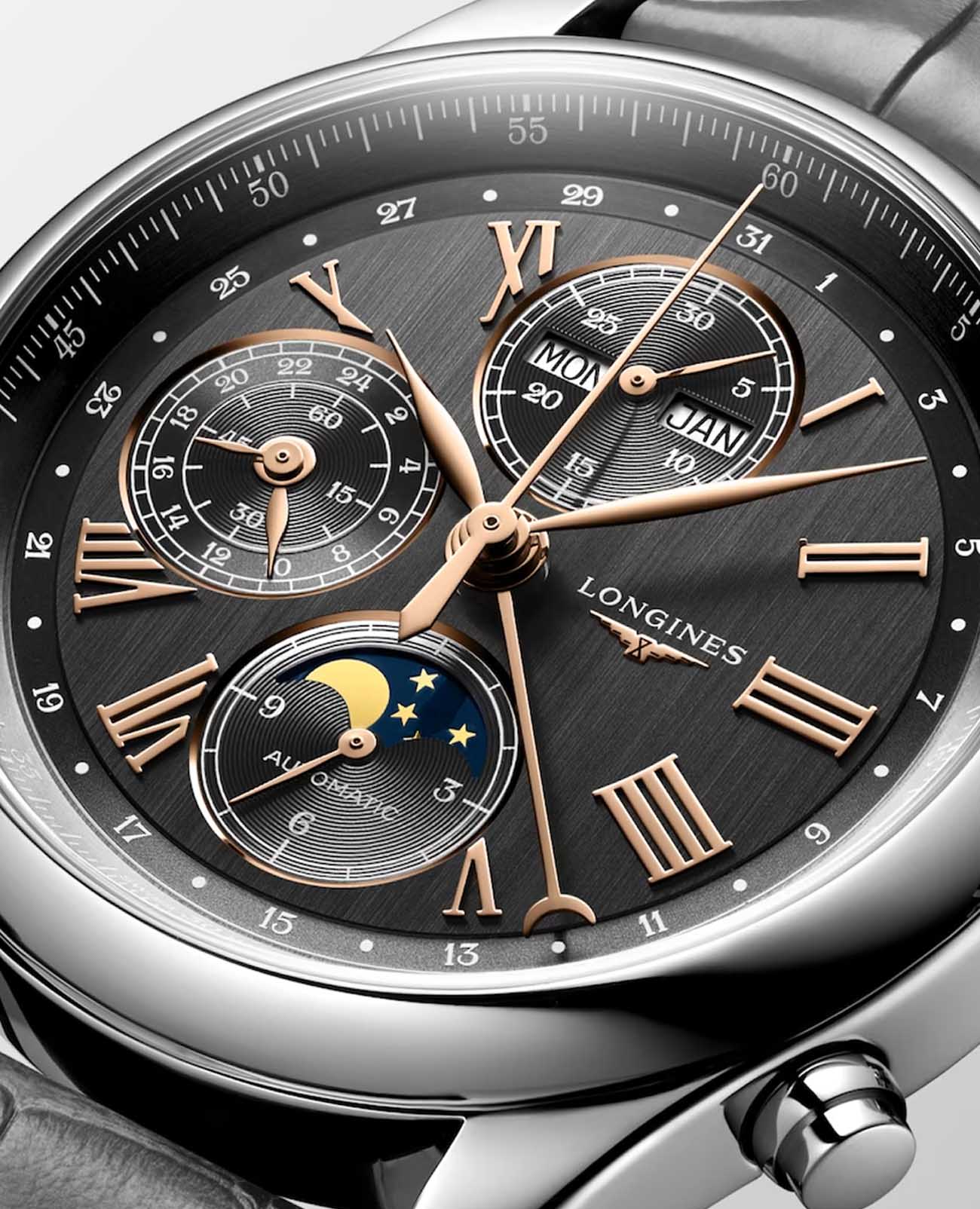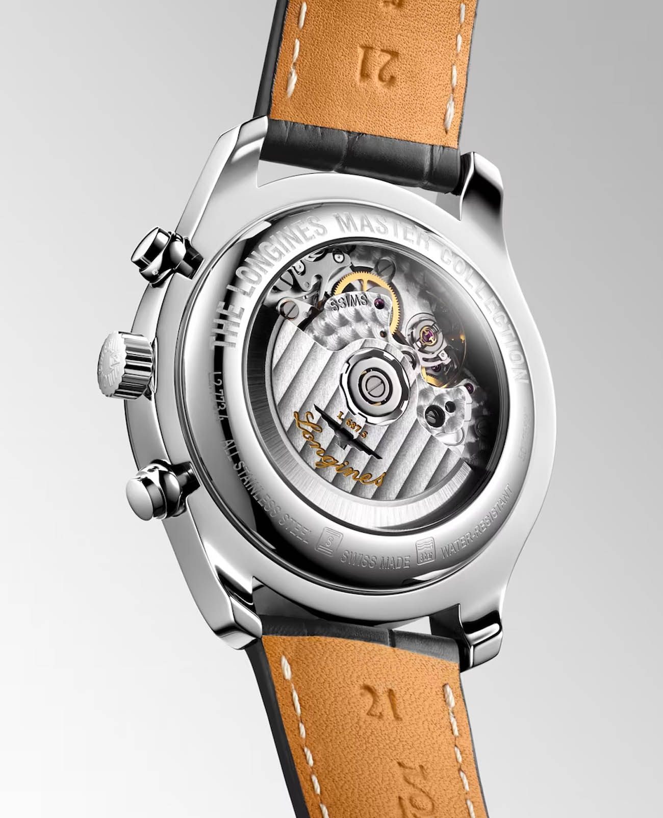 Мужсике швейцарские механические часы-хронографХронографФункция позволяет измерять отрезки времени с особой точностью: часы, минуты, секунды. Верным признаком хронографа является наличие на циферблате 3 дополнительных окошек-счётчиков. с автоподзаводом Longines Master Collection L2.773.4.61.2. Сапфировое стеклоСапфировое стеклоПрочный и надёжный материал из кристалла сапфира синтетического происхождения, характеризующийся особой твёрдостью и устойчивостью к царапинам и повреждениям. устойчивое к появлению царапин, обладающее высокой прозрачностью. Корпус часов изготовлен из нержавеющей стали. Функции: часы, минуты, малая секундная стрелка с 24-часовым индикатором в положении 9 часов. Дату показывает центральная стрелка с серповидным наконечником. Указатель фаз Луны в положении 6 часов. Прозрачная задняя крышка. Класс водозащиты: 30 метров, позволит защитить корпус от случайных брызг или капель дождя. Ремешок из кожи аллигатора на раскладной застёжкеРаскладная застёжкаТакой тип застёжки используется только на браслетах из металла. Она никогда не раскрывается полностью, происходит разделение на 2 и более частей. Раскладывающая застёжка снизит вероятность потери часов к минимуму..