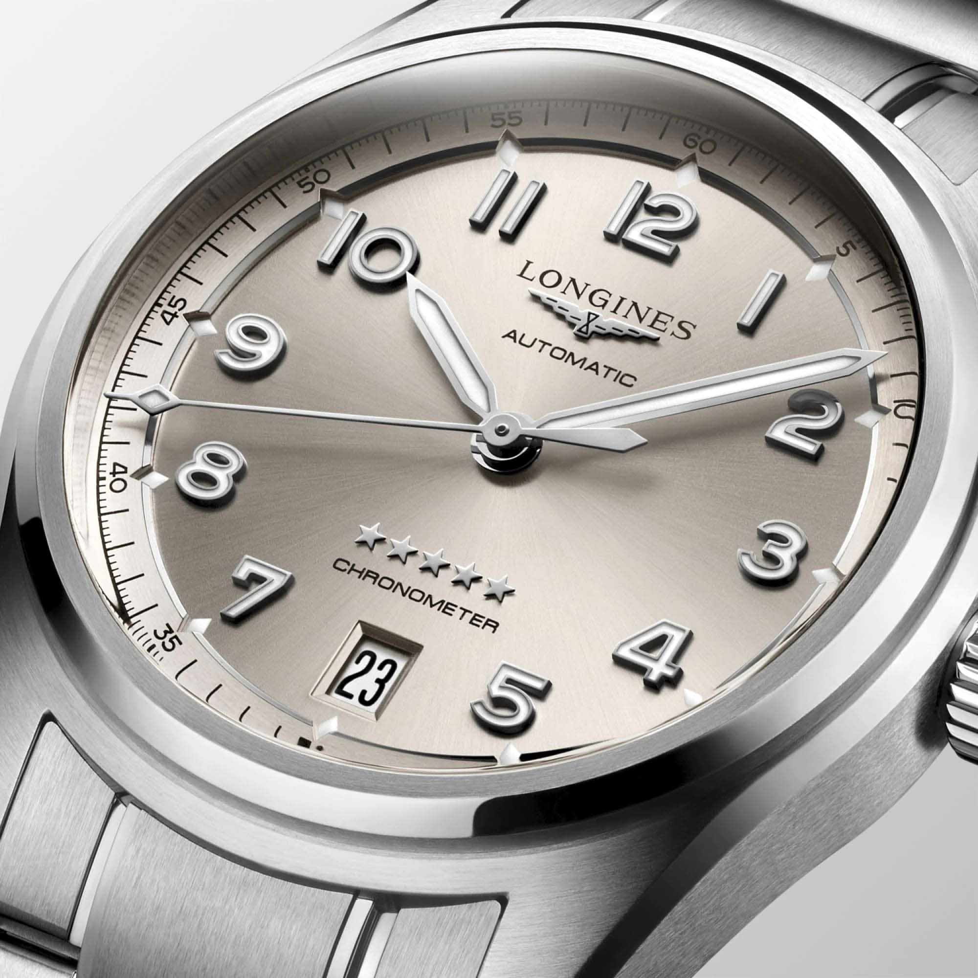 Швейцарские механические часы Longines Spirit L3.410.4.63.6 – высокоточный хронометр в стильном дизайне. Автоматический механизм с частотой баланса 25 200 полуколебаний в час и монокристаллической кремниевой спиралью баланса, обеспечивающей запас хода ок. 72 часов, сертифицирован COSCСертификат COSCОфициальный сертификат, подтверждающий то, что часы ходят с особо высокой точностью. Для получения документа часы подвергаются тестовым испытаниям, разработанным швейцарским институтом тестирования хронометров COSC. Допустимая норма для механических часов -4/+6 секунд в день, для кварцевых моделей +/- 0,07 секунд в день.. Дополнительные особенности: сапфировое стеклоСапфировое стеклоПрочный и надёжный материал из кристалла сапфира синтетического происхождения, характеризующийся особой твёрдостью и устойчивостью к царапинам и повреждениям. с двухсторонним антибликовым покрытиемАнтибликовое покрытиеСлой оксида металла в 0,13-0,3 микрон, благодаря которому стекло часов не бликует и не отражает свет. Антибликовое покрытие уменьшает отражение света в 10 раз, обеспечивая отличную читаемость показателей циферблата., люминесцентная подсветкаЛюминесцентное покрытиеПозволяет считывать показания времени в темноте. Производители наносят на стрелки, часовые индексы, безель или поверхность циферблата светонакопительный состав, дающий холодное свечение.. Окошко даты в положении 6 часов. Стрелки и метки с люминесцентнымЛюминесцентное покрытиеПозволяет считывать показания времени в темноте. Производители наносят на стрелки, часовые индексы, безель или поверхность циферблата светонакопительный состав, дающий холодное свечение. покрытием. Класс водозащиты: 100 метров, позволит плавать, нырять и заниматься другими водными видами спорта. Стальной браслет на застёжке «бабочка» с кнопкамиЗастёжка "бабочка"Такой вид застёжки дополняется предохранителями, помогающими избежать случайного раскрытия браслета. Обладают изящным исполнением. .