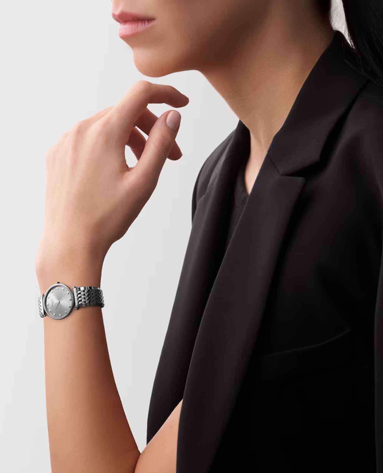 Женские швейцарские часы Longines La Grande Classique L4.512.4.70.6, кварцевый механизм с высокой точностью. Сапфировое стеклоСапфировое стеклоПрочный и надёжный материал из кристалла сапфира синтетического происхождения, характеризующийся особой твёрдостью и устойчивостью к царапинам и повреждениям. устойчивое к появлению царапин, обладающее высокой прозрачностью. Корпус часов изготовлен из стали. Циферблат с 12 бриллиантами группы Top Wesselton VS-SI общим весом 0.081 карата. Класс водозащиты: 30 метров, позволит защитить корпус от случайных брызг или капель дождя. Стальной браслет на застёжке-бабочке с кнопкамиЗастёжка "бабочка"Такой вид застёжки дополняется предохранителями, помогающими избежать случайного раскрытия браслета. Обладают изящным исполнением. .