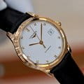 . Инкрустация бриллиантами превращает элегантные часы в изысканное украшение. Механизм с автоматическим подзаводом работает от амплитуды движения руки. Благодаря прозрачной задней крышке корпуса можно увидеть практически все детали механизма. Ремешок из кожи аллигатора с простой, подчеркивающей минимализм дизайна, золотой застежкой.