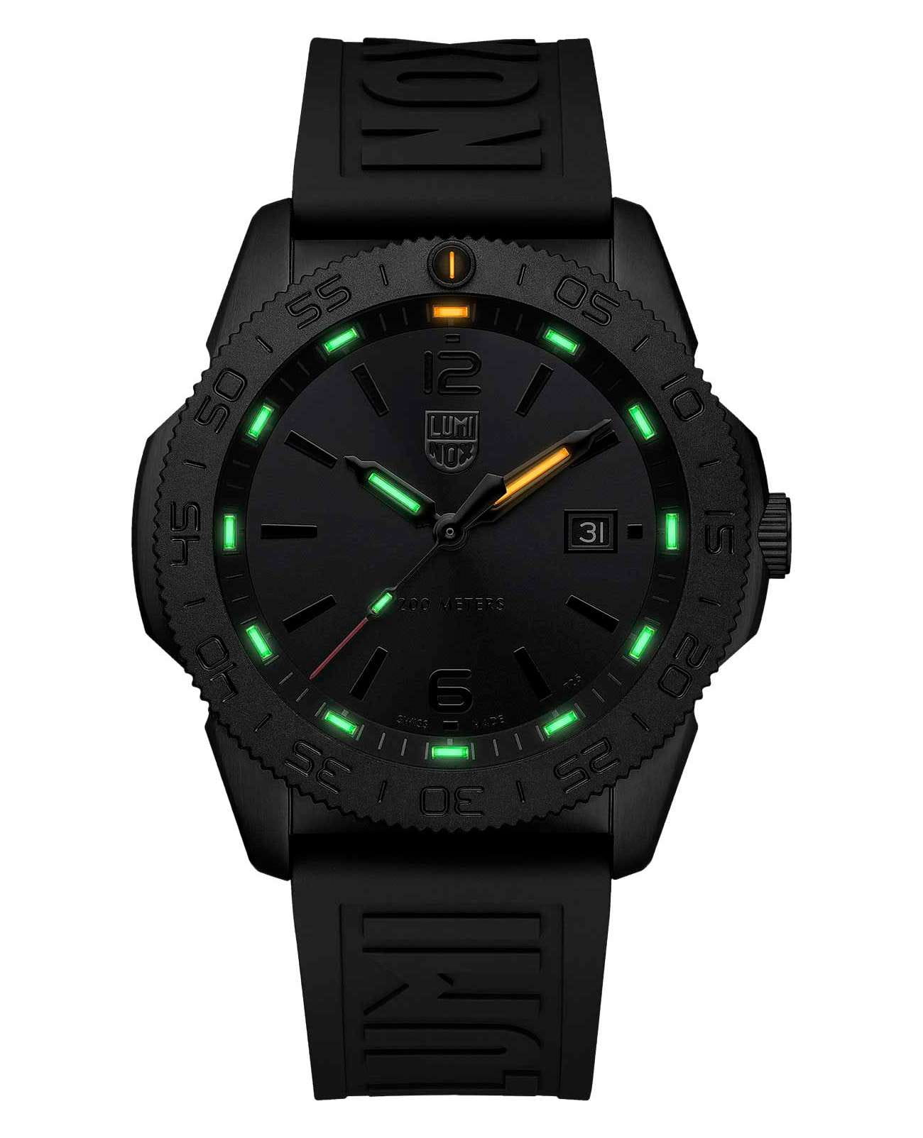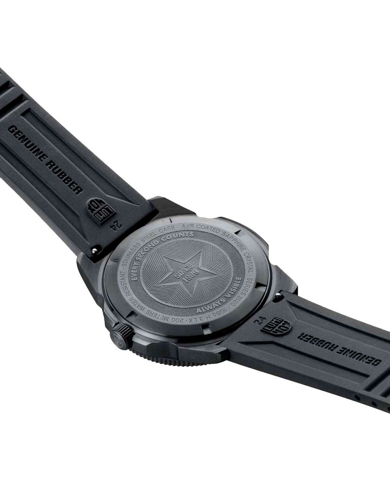 Мужские наручные часы Luminox XS.3121.BO.1 из коллекции Pacific Diver сочетают в себе спортивный дизайн и надежность швейцарского качества . Модель обладает круглым корпусом диаметром 44 мм, изготовленным из нержавеющей стали с PVD-покрытиемPVDУльтратонкое покрытие наносится в технике вакуумного напыления, сочетает в себе нитрид титана особой прочности со слоем золота или оксида хрома. Несёт в себе декоративную или защитную функцию., что обеспечивает высокую устойчивость к внешним воздействиям и долговечность . Циферблат черного цвета украшен контрастными метками и стрелками с люминесцентным покрытиемЛюминесцентное покрытиеПозволяет считывать показания времени в темноте. Производители наносят на стрелки, часовые индексы, безель или поверхность циферблата светонакопительный состав, дающий холодное свечение., гарантирующим постоянную видимость времени даже в условиях низкой освещенности благодаря системе LLTLLTLLT — это автономный механизм подсветки, основанный на использовании микроскопических газонаполненных элементов. Специальные герметичные капсулы из боросиликатного стекла, интегрированные в циферблат, генерируют свечение без необходимости подключения к внешним источникам энергии. Для их работы не требуется ни дополнительный свет, ни механическое воздействие (например, нажатие кнопки). Свечение возникает благодаря химическому процессу: реакция между тритием, заключенным в капсулах, и люминофорным покрытием создает стабильное автономное освещение. Технология обеспечивает энергетическую независимость и долговечность подсветки. (микрогазовые огни) . Часы оснащены кварцевым механизмом швейцарского производства Ronda 515, обеспечивающим точность хода ±15 секунд в месяц . Защиту циферблата обеспечивает прочное сапфировое стеклоСапфировое стеклоПрочный и надёжный материал из кристалла сапфира синтетического происхождения, характеризующийся особой твёрдостью и устойчивостью к царапинам и повреждениям. с антибликовым покрытиемАнтибликовое покрытиеСлой оксида металла в 0,13-0,3 микрон, благодаря которому стекло часов не бликует и не отражает свет. Антибликовое покрытие уменьшает отражение света в 10 раз, обеспечивая отличную читаемость показателей циферблата., устойчивое к царапинам и механическим повреждениям. Водонепроницаемость модели достигает 20 атмосфер (200 метров), что делает их подходящими для плавания и активного отдыха на воде, включая дайвинг . Модель также оснащена безелемБезельВнешний ободок, закрепляющий стекло. В спортивных часах так называется поворотное кольцо с делениями на циферблате, выполняет роль таймера – замеряет отрезки времени на шкале. Неподвижный безель – элемент декора. Однонаправленно вращающийся безель на дайверских часах позволяет фиксировать моменты погружения и выныривания на поверхность. из карбонаКарбонОт «carbon», «carbone» - углерод, углепластик - полимерный композиционный материал из переплетённых под определенным углом между собой нитей углеродного волокна, применяется для изготовления лёгких, но прочных деталей. В часах часто используют для украшения циферблатов и ремешков. Так же карбон используется в изготовлении корпусов. Такие корпуса обладают антикоррозионным свойством, не поддаются электромагнитному излучению, обладают повышенной прочностью и противоударностью. (CARBONOX™