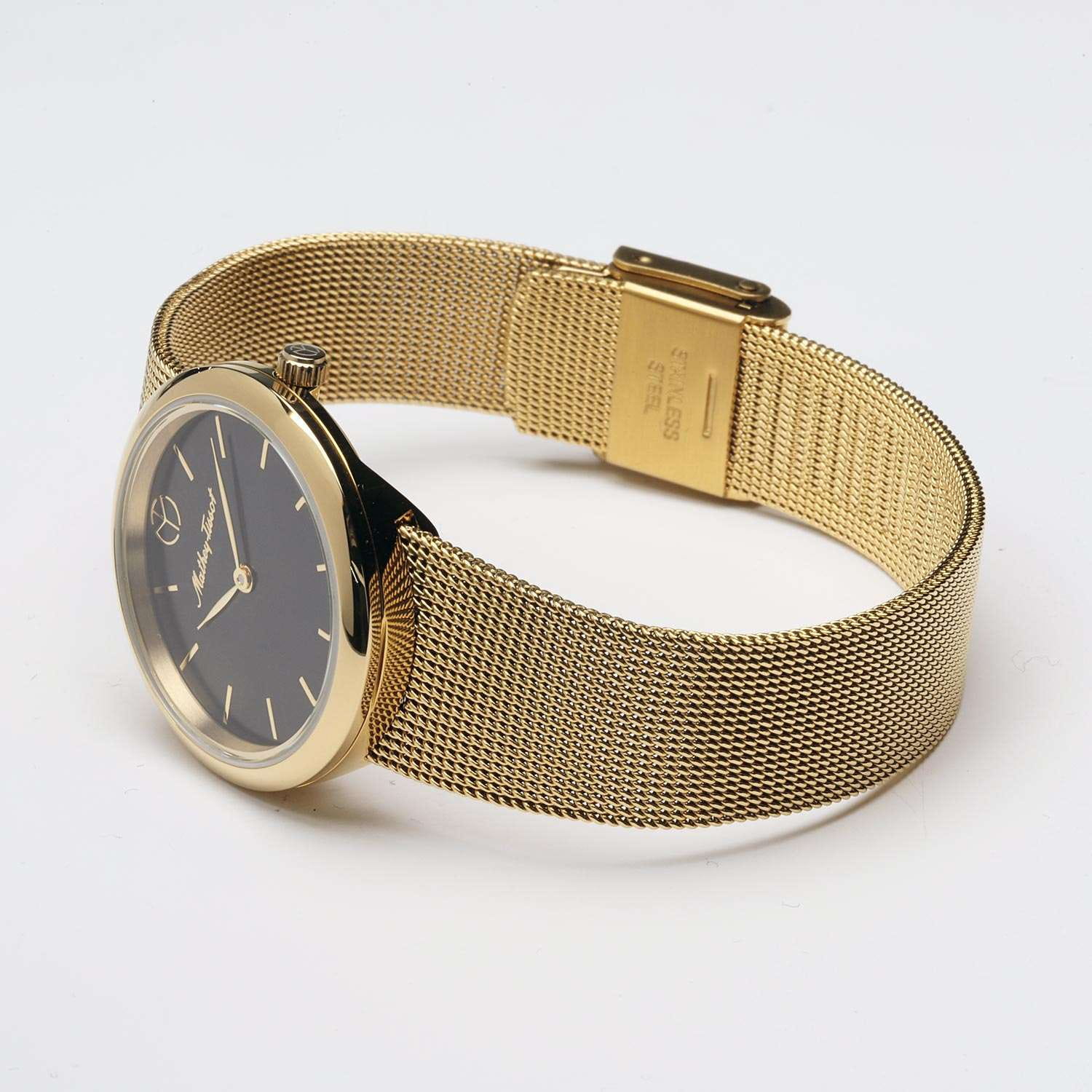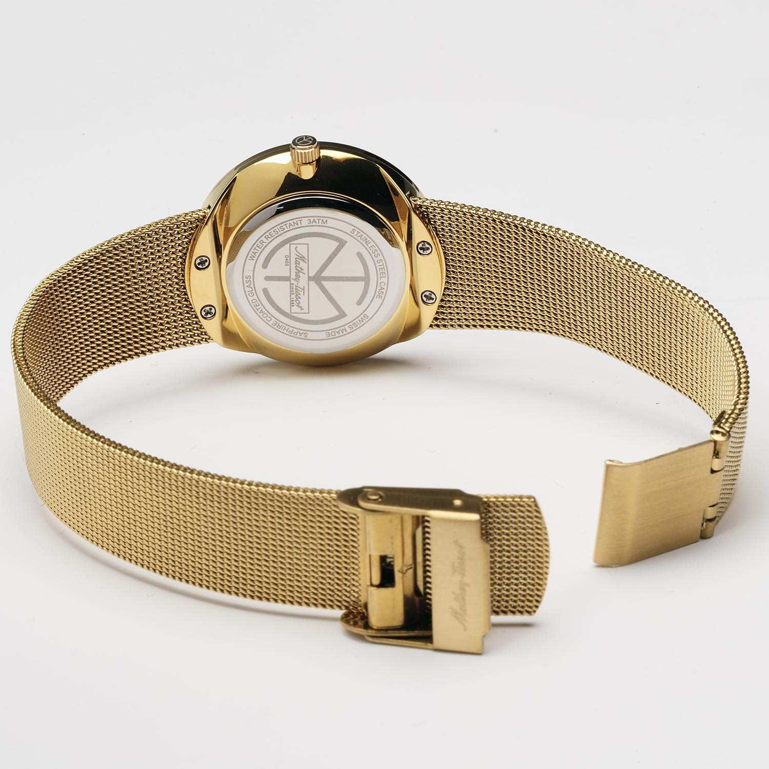 Женские кварцевые часы Mathey-Tissot Milly D403PYN — это стильное сочетание элегантности и современного дизайна. Изящный корпус выполнен из нержавеющей стали с PVD-покрытиемPVDУльтратонкое покрытие наносится в технике вакуумного напыления, сочетает в себе нитрид титана особой прочности со слоем золота или оксида хрома. Несёт в себе декоративную или защитную функцию. золотистого цвета, диаметром 30 мм, что придаст образу элегантности и надежности. Изысканный перламутровый циферблат с метками в виде штрихов придает модели особый блеск. Циферблат защищен минеральным стекломМинеральное стеклоМинеральное стекло представляет собой искусственно выращенный минерал кварца. Такое стекло отличается особой устойчивостью к повреждениям и царапинам. Уступает по некоторым качествам сапфировому стеклу. с сапфировым покрытием, обеспечивает устойчивость к царапинам. Часы оснащены надежным кварцевым механизмом. Стальной браслет с PVD-покрытиемPVDУльтратонкое покрытие наносится в технике вакуумного напыления, сочетает в себе нитрид титана особой прочности со слоем золота или оксида хрома. Несёт в себе декоративную или защитную функцию. миланского плетения на раскладном замкеРаскладная застёжкаТакой тип застёжки используется только на браслетах из металла. Она никогда не раскрывается полностью, происходит разделение на 2 и более частей. Раскладывающая застёжка снизит вероятность потери часов к минимуму., гарантирует комфортное и безопасное ношение. Класс водозащиты: 30 метров позволит защитить корпус от случайных брызг или капель дождя. Mathey-Tissot — отличный выбор для тех, кто ценит утонченность и качество.