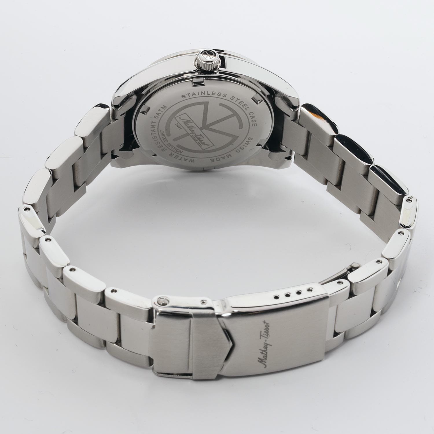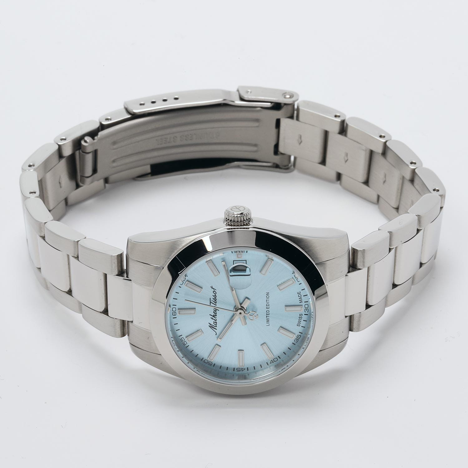 Женские кварцевые часы Mathey-Tissot Mathy D451BU — это стильное сочетание элегантности и современного дизайна. Лимитированная серия. Изящный корпус выполнен из нержавеющей стали, диаметром 32 мм, что придаст образу женственности и романтизма. Изысканный циферблат с метками в виде штрихов придает модели особый блеск. Циферблат защищен минеральным стекломМинеральное стеклоМинеральное стекло представляет собой искусственно выращенный минерал кварца. Такое стекло отличается особой устойчивостью к повреждениям и царапинам. Уступает по некоторым качествам сапфировому стеклу., обеспечивающий устойчивость к царапинам. Стрелки и метки с люминесцентным покрытиемЛюминесцентное покрытиеПозволяет считывать показания времени в темноте. Производители наносят на стрелки, часовые индексы, безель или поверхность циферблата светонакопительный состав, дающий холодное свечение.. Окошко даты находится в положении 3 часа. Часы оснащены надежным кварцевым механизмом. Стальной браслет на раскладной застёжке с фиксаторомРаскладная застёжкаТакой тип застёжки используется только на браслетах из металла. Она никогда не раскрывается полностью, происходит разделение на 2 и более частей. Раскладывающая застёжка снизит вероятность потери часов к минимуму., гарантирует комфортное и безопасное ношение. Класс водозащиты: 50 метров позволит защитить корпус от случайных брызг или капель дождя. Mathey-Tissot — отличный выбор для тех, кто ценит утонченность и качество.