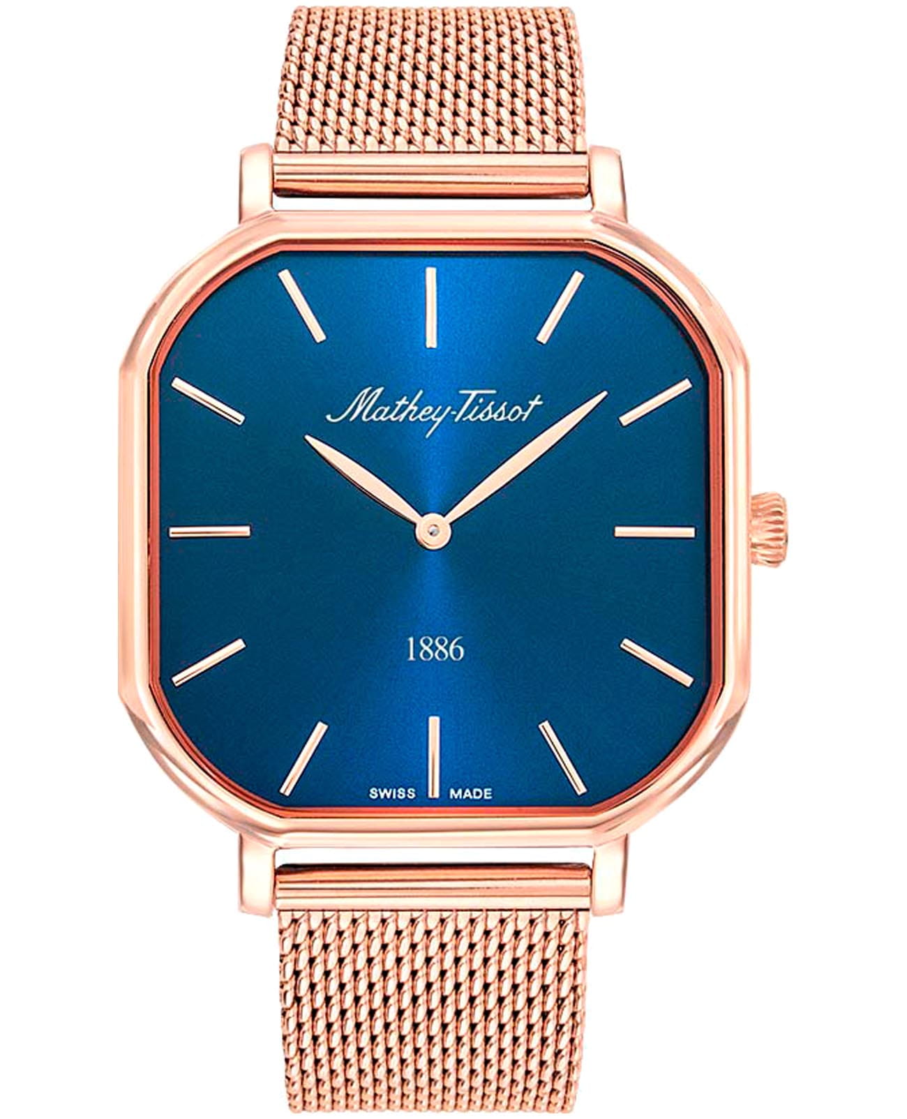 Мужские кварцевые часы Mathey-Tissot Monsoon H7917PBU — это стильное сочетание элегантности и современного дизайна. Изящный корпус выполнен из нержавеющей стали с PVD-покрытиемPVDУльтратонкое покрытие наносится в технике вакуумного напыления, сочетает в себе нитрид титана особой прочности со слоем золота или оксида хрома. Несёт в себе декоративную или защитную функцию. цвета розового золота, размером 40х40 мм, что придаст образу элегантности и надежности. Изысканный циферблат с метками в виде штрихов придает модели особый блеск. Циферблат выполнен по технологии Sunray (солнечные лучи) и защищен минеральным стекломМинеральное стеклоМинеральное стекло представляет собой искусственно выращенный минерал кварца. Такое стекло отличается особой устойчивостью к повреждениям и царапинам. Уступает по некоторым качествам сапфировому стеклу. с сапфировым покрытием, обеспечивает устойчивость к царапинам. Часы оснащены надежным кварцевым механизмом. Стальной браслет с PVD-покрытиемPVDУльтратонкое покрытие наносится в технике вакуумного напыления, сочетает в себе нитрид титана особой прочности со слоем золота или оксида хрома. Несёт в себе декоративную или защитную функцию. миланского плетения на раскладном замкеРаскладная застёжкаТакой тип застёжки используется только на браслетах из металла. Она никогда не раскрывается полностью, происходит разделение на 2 и более частей. Раскладывающая застёжка снизит вероятность потери часов к минимуму., гарантирует комфортное и безопасное ношение. Класс водозащиты: 50 метров позволит защитить корпус от случайных брызг или капель дождя. Mathey-Tissot — отличный выбор для тех, кто ценит утонченность и качество.