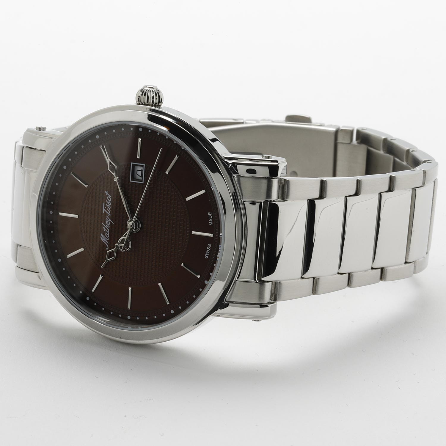 Мужские кварцевые часы Mathey-Tissot City Metal HB611251MAM — это стильное сочетание элегантности и современного дизайна. Изящный корпус выполнен из нержавеющей стали 316L серебристого цвета, диаметром 42 мм, что придаст образу элегантности и надежности. Изысканный циферблат с метками в виде штрихов придает модели особый блеск. Циферблат защищен минеральным стекломМинеральное стеклоМинеральное стекло представляет собой искусственно выращенный минерал кварца. Такое стекло отличается особой устойчивостью к повреждениям и царапинам. Уступает по некоторым качествам сапфировому стеклу. с сапфировым покрытием, обеспечивающий устойчивость к царапинам. Окошко даты находится в положении 3 часа. Часы оснащены надежным кварцевым механизмом. Стальной браслет на раскладной застёжкеРаскладная застёжкаТакой тип застёжки используется только на браслетах из металла. Она никогда не раскрывается полностью, происходит разделение на 2 и более частей. Раскладывающая застёжка снизит вероятность потери часов к минимуму., гарантирует комфортное и безопасное ношение. Класс водозащиты: 30 метров позволит защитить корпус от случайных брызг или капель дождя. Mathey-Tissot — отличный выбор для тех, кто ценит утонченность и качество.
