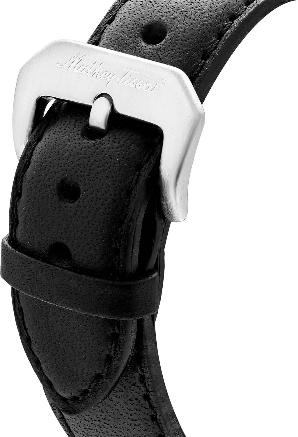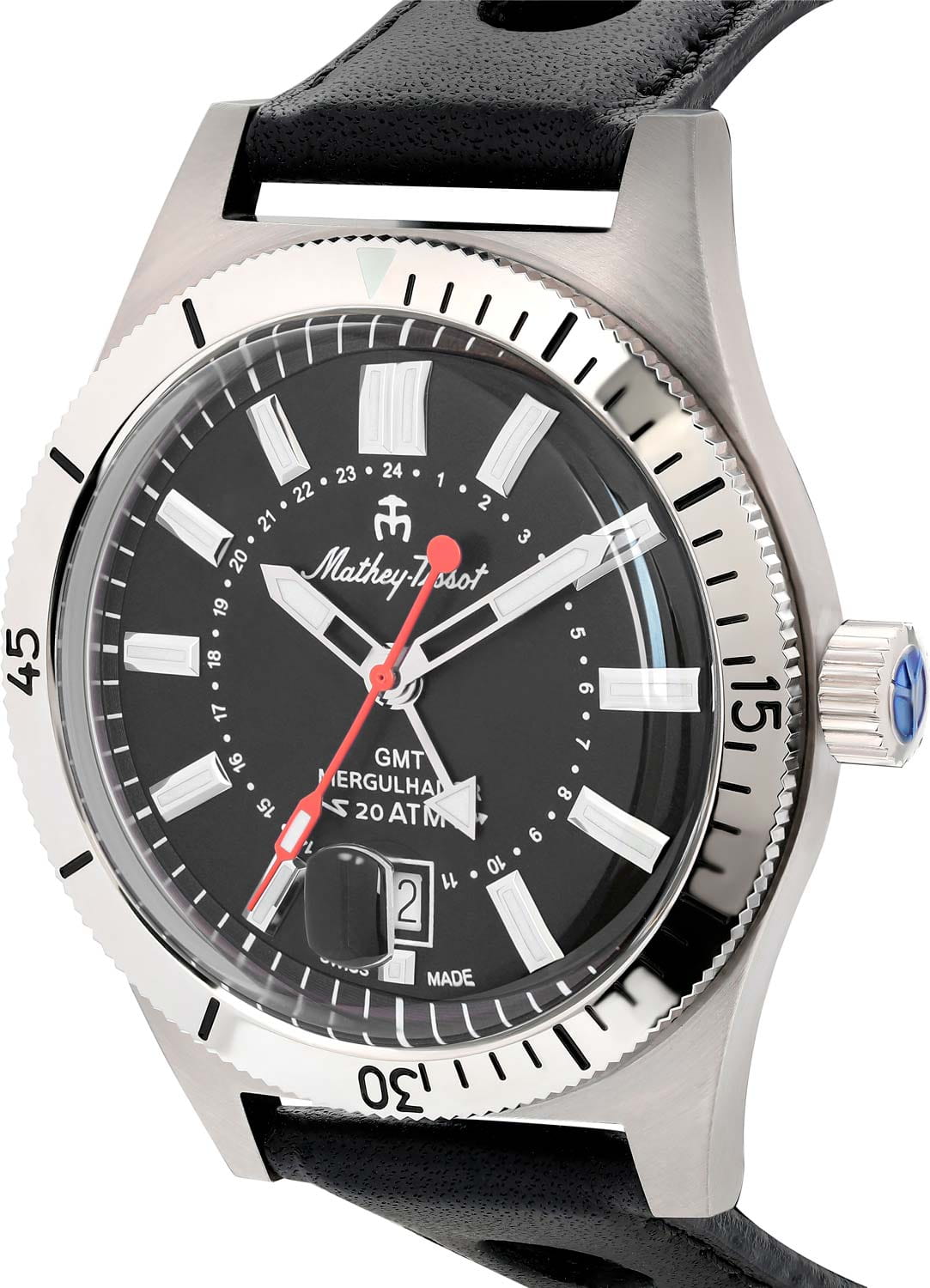 Мужские кварцевые часы Mathey-Tissot Mergulhador GMTGMTОтображение времени второго часового пояса.Такая функция особенно актуальна для путешественников и бизнесменов,которые общаются с людьми из разных стран,теперь вы всегда будете знать,какой час у вашего партнёра или близкого человека. MRGAN — это стильное сочетание элегантности и современного дизайна. Изящный корпус выполнен из нержавеющей стали, диаметром 41 мм, что придаст образу элегантности и надежности. Циферблат с метками в виде штрихов придает модели особый блеск. Циферблат защищен минеральным стекломМинеральное стеклоМинеральное стекло представляет собой искусственно выращенный минерал кварца. Такое стекло отличается особой устойчивостью к повреждениям и царапинам. Уступает по некоторым качествам сапфировому стеклу. с сапфировым покрытием, обеспечивает устойчивость к царапинам. Второй часовой поясВторой часовой поясФункция, позволяющая отображать время двух часовых поясов одновременно. в 24-х часовом формате времени отображается центральной стрелкой. Стрелки и метки с люминесцентным покрытиемЛюминесцентное покрытиеПозволяет считывать показания времени в темноте. Производители наносят на стрелки, часовые индексы, безель или поверхность циферблата светонакопительный состав, дающий холодное свечение. SuperLumiNova, которое светится в темноте после непродолжительной зарядки на свету. Окошко даты находится в положении 6 часов. Рифленый безельБезельВнешний ободок, закрепляющий стекло. В спортивных часах так называется поворотное кольцо с делениями на циферблате, выполняет роль таймера – замеряет отрезки времени на шкале. Неподвижный безель – элемент декора. Однонаправленно вращающийся безель на дайверских часах позволяет фиксировать моменты погружения и выныривания на поверхность. с минутными отметками вращается в одном направлении. Часы оснащены надежным кварцевым механизмом. Кожаный ремешок на стандартной застёжке гарантирует комфортное и безопасное ношение. Класс водозащиты: 200 метров позволит плавать, нырять и заниматься другими водными видами спорта. Mathey-Tissot — отличный выбор для тех, кто ценит утонченность и качество.
