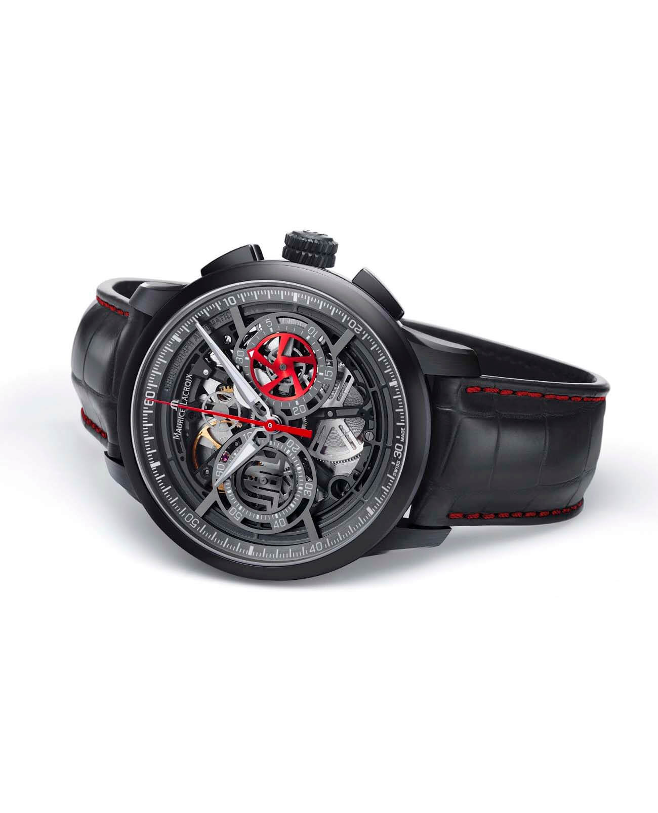 Мужские швейцарские механические часы c хронографом из ограниченной серии Maurice Lacroix Masterpiece MP6028-PVB01-001-1, механический механизм (автоматический калибр) с высокой точностью. Сапфировое стекло устойчивое к появлению царапин, обладающее высокой прозрачностью. Класс водозащиты: 100 метров, позволит плавать, нырять и заниматься другими водными видами спорта. Корпус часов изготовлен из стали, черного цвета.
