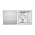 Женские американские часы Michael Kors Darci MK3429, кварцевый механизм с высокой точностью. Минеральное стеклоМинеральное стеклоМинеральное стекло представляет собой искусственно выращенный минерал кварца. Такое стекло отличается особой устойчивостью к повреждениям и царапинам. Уступает по некоторым качествам сапфировому стеклу., устойчивое к мелким механическим повреждениям. Корпус часов выполнен из нержавеющей стали. БезельБезельВнешний ободок, закрепляющий стекло. В спортивных часах так называется поворотное кольцо с делениями на циферблате, выполняет роль таймера – замеряет отрезки времени на шкале. Неподвижный безель – элемент декора. Однонаправленно вращающийся безель на дайверских часах позволяет фиксировать моменты погружения и выныривания на поверхность. украшен кристаллами. Класс водозащиты: 50 метров, позволит защитить корпус от случайных брызг или капель дождя. Стальной браслет на раскладной застёжкеРаскладная застёжкаТакой тип застёжки используется только на браслетах из металла. Она никогда не раскрывается полностью, происходит разделение на 2 и более частей. Раскладывающая застёжка снизит вероятность потери часов к минимуму..