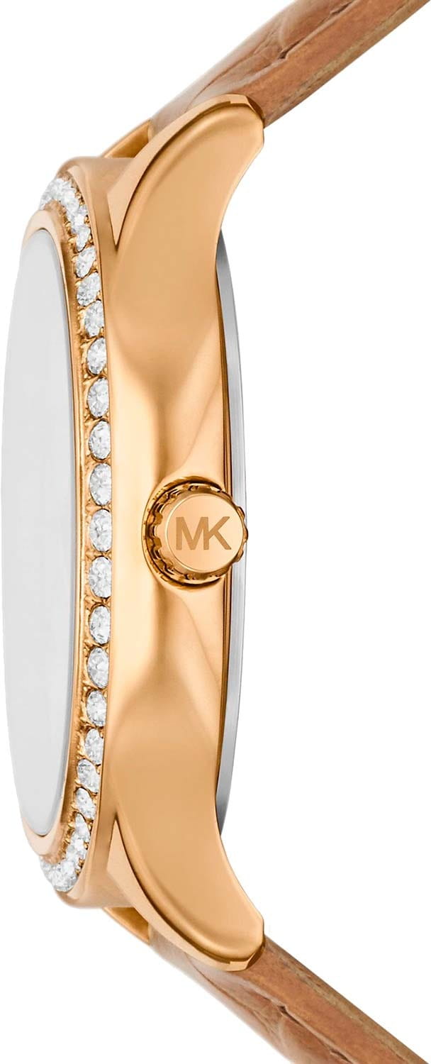 Эти часы — идеальный аксессуар, который придаст женскому образу завершенность и особый шарм. Женские американские часы Michael Kors Sage MK4819 имеют кварцевый механизм с высокой точностью. Корпус и безельБезельВнешний ободок, закрепляющий стекло. В спортивных часах так называется поворотное кольцо с делениями на циферблате, выполняет роль таймера – замеряет отрезки времени на шкале. Неподвижный безель – элемент декора. Однонаправленно вращающийся безель на дайверских часах позволяет фиксировать моменты погружения и выныривания на поверхность.часов изготовлены из нержавеющей стали с золотистым PVD-покрытиемPVDУльтратонкое покрытие наносится в технике вакуумного напыления, сочетает в себе нитрид титана особой прочности со слоем золота или оксида хрома. Несёт в себе декоративную или защитную функцию.. Перламутровый циферблат и безельБезельВнешний ободок, закрепляющий стекло. В спортивных часах так называется поворотное кольцо с делениями на циферблате, выполняет роль таймера – замеряет отрезки времени на шкале. Неподвижный безель – элемент декора. Однонаправленно вращающийся безель на дайверских часах позволяет фиксировать моменты погружения и выныривания на поверхность. украшены кристаллами. Циферблат с метками в виде римских цифр и штрихов защищен минеральным стекломМинеральное стеклоМинеральное стекло представляет собой искусственно выращенный минерал кварца. Такое стекло отличается особой устойчивостью к повреждениям и царапинам. Уступает по некоторым качествам сапфировому стеклу., что обеспечивает надежную защиту от царапин и повреждений. Секундная стрелка вынесена на отдельный циферблат, обрамленный кристаллами, что придает часам уникальный и стильный вид. Люминесцентное покрытиеЛюминесцентное покрытиеПозволяет считывать показания времени в темноте. Производители наносят на стрелки, часовые индексы, безель или поверхность циферблата светонакопительный состав, дающий холодное свечение. на стрелках обеспечивает отличную видимость в темноте. Класс водозащиты: 50 метров, позволит защитить корпус от случайных брызг или капель дождя. Удобный кожаный коричневый ремешок с тиснением под кожу крокодила с классической застежкой обеспечивает надежную фиксацию на запястье и легкость в надевании и снятии. Эти часы станут отличным дополнением к любому наряду, подчеркивая индивидуальность и стиль их обладательницы.