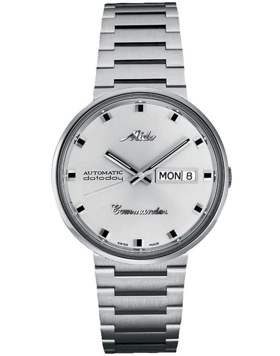 Серебристый циферблат с фирменным логотипом Mido 1950-х годов украшен накладными индексами и стрелками  с люминесцентным покрытиемЛюминесцентное покрытиеПозволяет считывать показания времени в темноте. Производители наносят на стрелки, часовые индексы, безель или поверхность циферблата светонакопительный состав, дающий холодное свечение., обеспечивающим читаемость даже в условиях слабого освещения. На «3 часах» расположено двойное окошко календаря — день недели и дата. Стальной браслет на раскладной застёжкеРаскладная застёжкаТакой тип застёжки используется только на браслетах из металла. Она никогда не раскрывается полностью, происходит разделение на 2 и более частей. Раскладывающая застёжка снизит вероятность потери часов к минимуму..