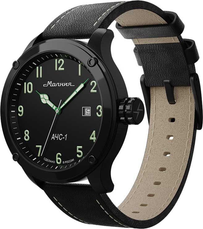 Мужские механические часы с автоподзаводом — это надёжный аксессуар от легендарного бренда «МОЛНИЯ», созданного на Челябинском часовом заводе. Корпус диаметром 44 мм выполнен из нержавеющей стали с IP-покрытиемIP-покрытиеМетод ионного напыления. Демонстрирует повышенную устойчивость к истиранию, окислению и химическим веществам. Под воздействием высокого давления и температуры около 1500°C молекулы металла надёжно соединяются с частицами корпуса часов.. Циферблат чёрного цвета оформлен стрелками и индексами со светонакопительным составом Super-LumiNova. Окошко даты расположено в положении 3 часов. Циферблат защищён сапфировым стекломСапфировое стеклоПрочный и надёжный материал из кристалла сапфира синтетического происхождения, характеризующийся особой твёрдостью и устойчивостью к царапинам и повреждениям.. Механизм — японский автоматический калибр Miyota 8215. Часы оснащены кожаным ремешком чёрного цвета с классической пряжкой. Водонепроницаемость 100 м позволяет использовать часы для плавания и повседневного ношения. Идеальный выбор для тех, кто ценит российское качество и мужественный дизайн.