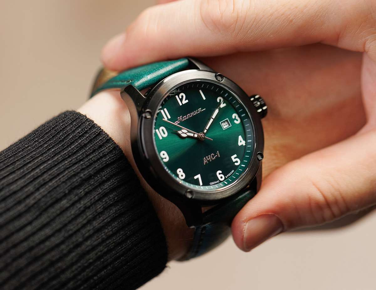 Мужские механические часы с автоподзаводом — это надёжный аксессуар от легендарного бренда «МОЛНИЯ», созданного на Челябинском часовом заводе. Корпус диаметром 44 мм и высотой 12 мм выполнен из нержавеющей стали 316L с IP-покрытиемIP-покрытиеМетод ионного напыления. Демонстрирует повышенную устойчивость к истиранию, окислению и химическим веществам. Под воздействием высокого давления и температуры около 1500°C молекулы металла надёжно соединяются с частицами корпуса часов.. Циферблат зелёного цвета матовый, оформлен стрелками и индексами с люминесцентным покрытиемЛюминесцентное покрытиеПозволяет считывать показания времени в темноте. Производители наносят на стрелки, часовые индексы, безель или поверхность циферблата светонакопительный состав, дающий холодное свечение. Super-LumiNova. Окошко даты расположено в положении 3 часов. Циферблат защищён сапфировым стекломСапфировое стеклоПрочный и надёжный материал из кристалла сапфира синтетического происхождения, характеризующийся особой твёрдостью и устойчивостью к царапинам и повреждениям. толщиной 1,5 мм. Механизм — японский автоматический калибр Miyota 8215 с функцией и запасом хода 42 часа. Часы оснащены кожаным ремешком зелёного цвета шириной 22 мм с классической пряжкой. Водонепроницаемость 100 м позволяет использовать часы для плавания и повседневного ношения. Идеальный выбор для тех, кто ценит российское качество и мужественный дизайн.