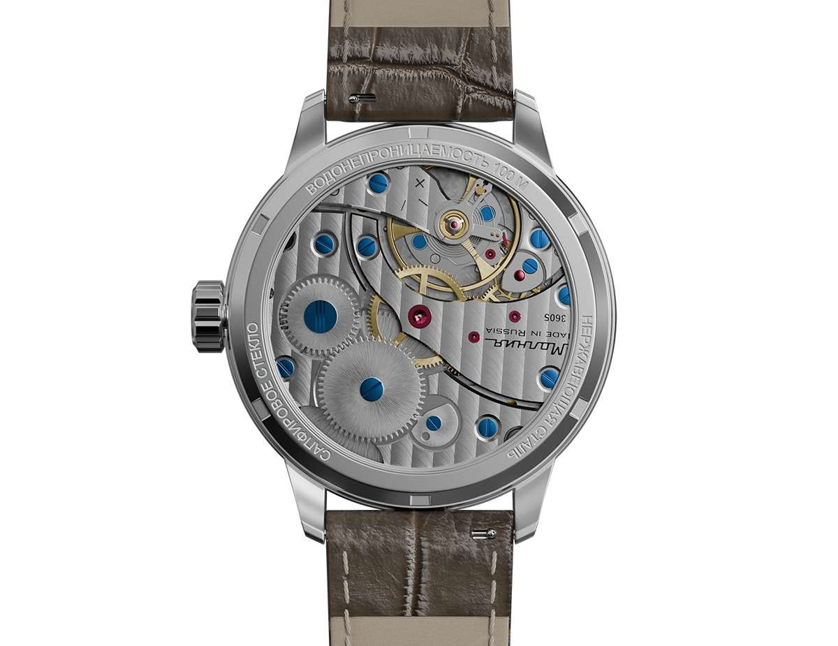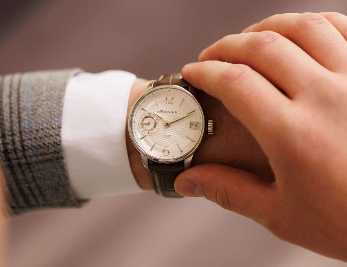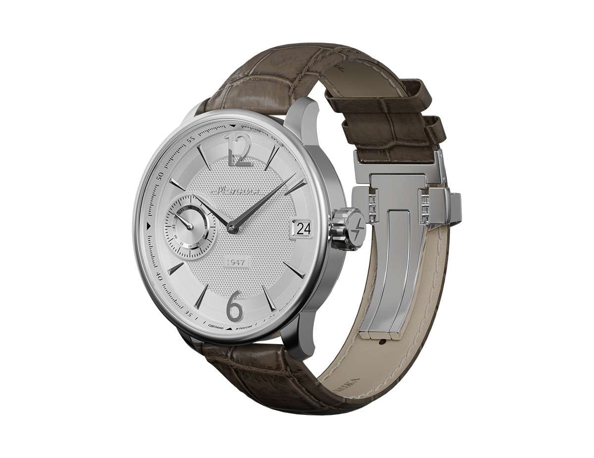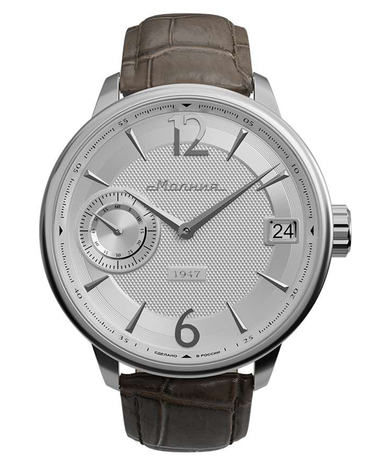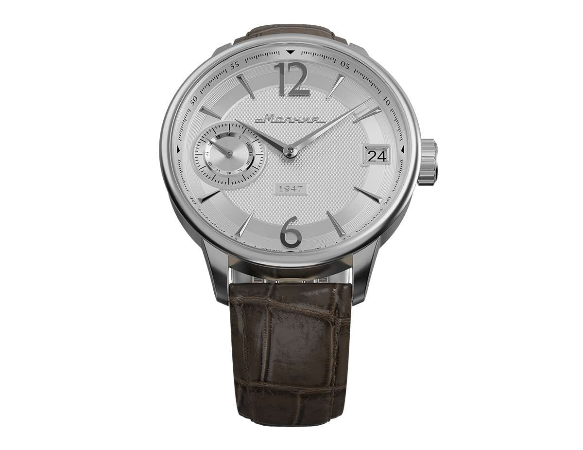 Мужские механические часы с ручным подзаводом — это аксессуар от легендарного бренда «МОЛНИЯ», созданный на Челябинском часовом заводе. Корпус диаметром 41 мм выполнен из нержавеющей стали 316L с зеркальной полировкой. Циферблат белого цвета оформлен арабскими цифрами и стальными индексами. Малая секундная стрелка вынесена на позицию 9 часов, окошко даты расположено в положении 3 часов. Циферблат защищён сапфировым стекломСапфировое стеклоПрочный и надёжный материал из кристалла сапфира синтетического происхождения, характеризующийся особой твёрдостью и устойчивостью к царапинам и повреждениям.. Механизм — мануфактурный калибр 3605, собранный вручную. Прозрачная задняя крышка позволяет наблюдать за работой механизма. Часы оснащены кожаным ремешком коричневого цвета с раскладной застёжкойРаскладная застёжкаТакой тип застёжки используется только на браслетах из металла. Она никогда не раскрывается полностью, происходит разделение на 2 и более частей. Раскладывающая застёжка снизит вероятность потери часов к минимуму. и системой быстрой замены. Водонепроницаемость 100 м позволяет использовать часы для плавания и повседневного ношения. Идеальный выбор для тех, кто ценит российское качество и традиции.