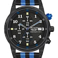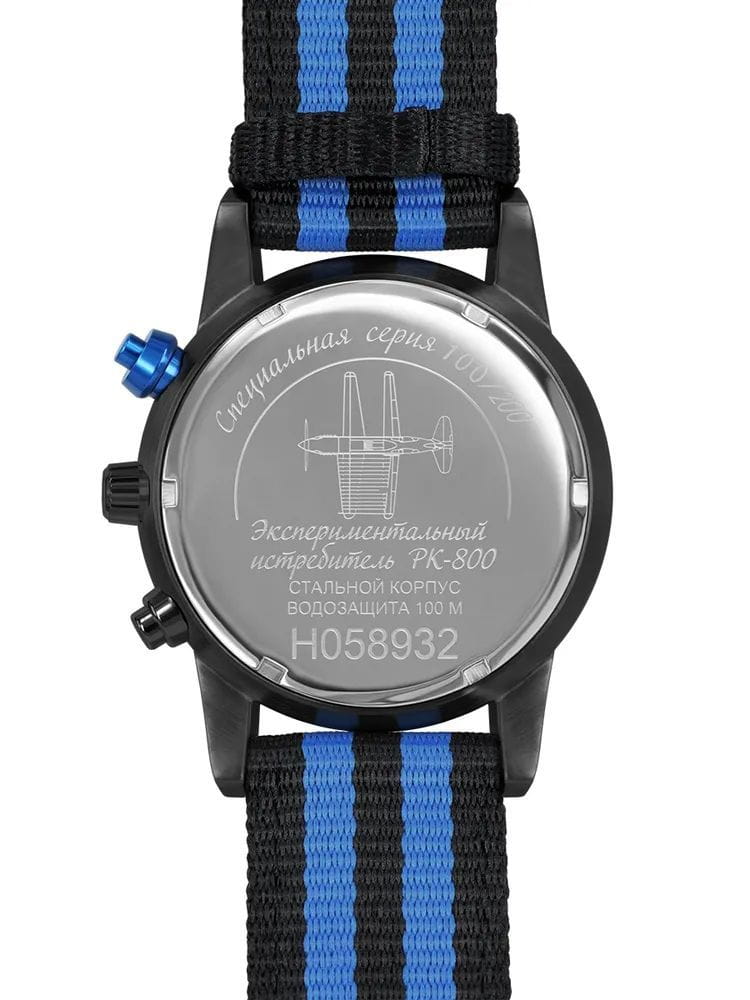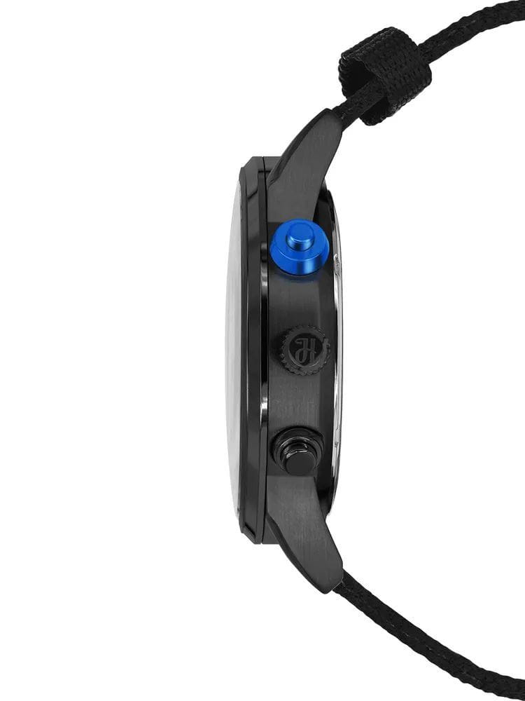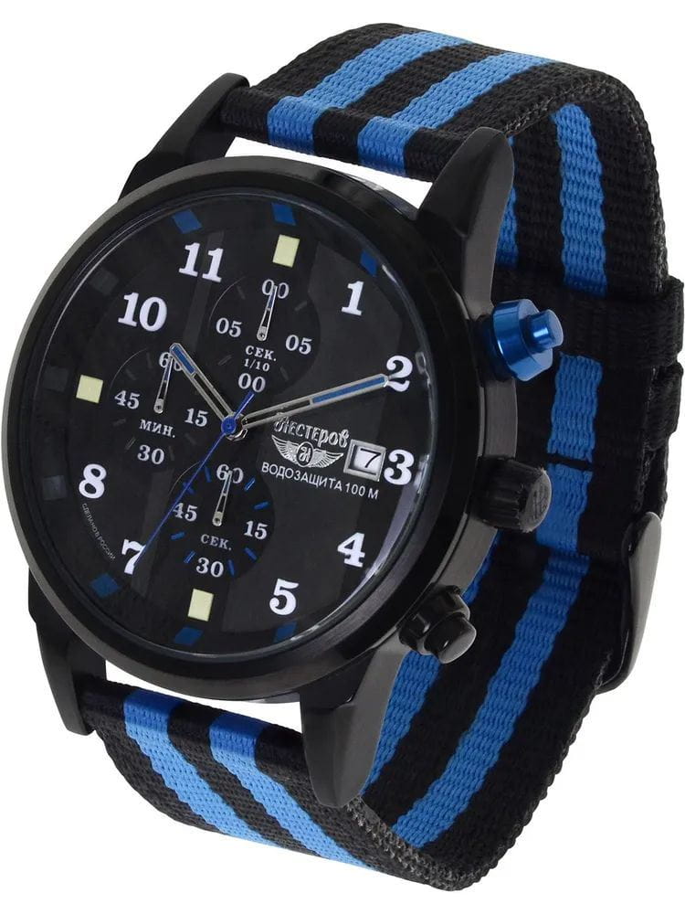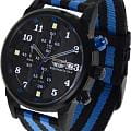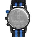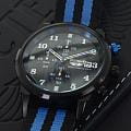 Ремешок выполнен из прочного нейлона в чёрно-синей цветовой гамме, обеспечивая комфорт при носке и добавляя модели спортивный характер.  Толщина корпуса составляет 10 мм, что придаёт часам солидный вид.