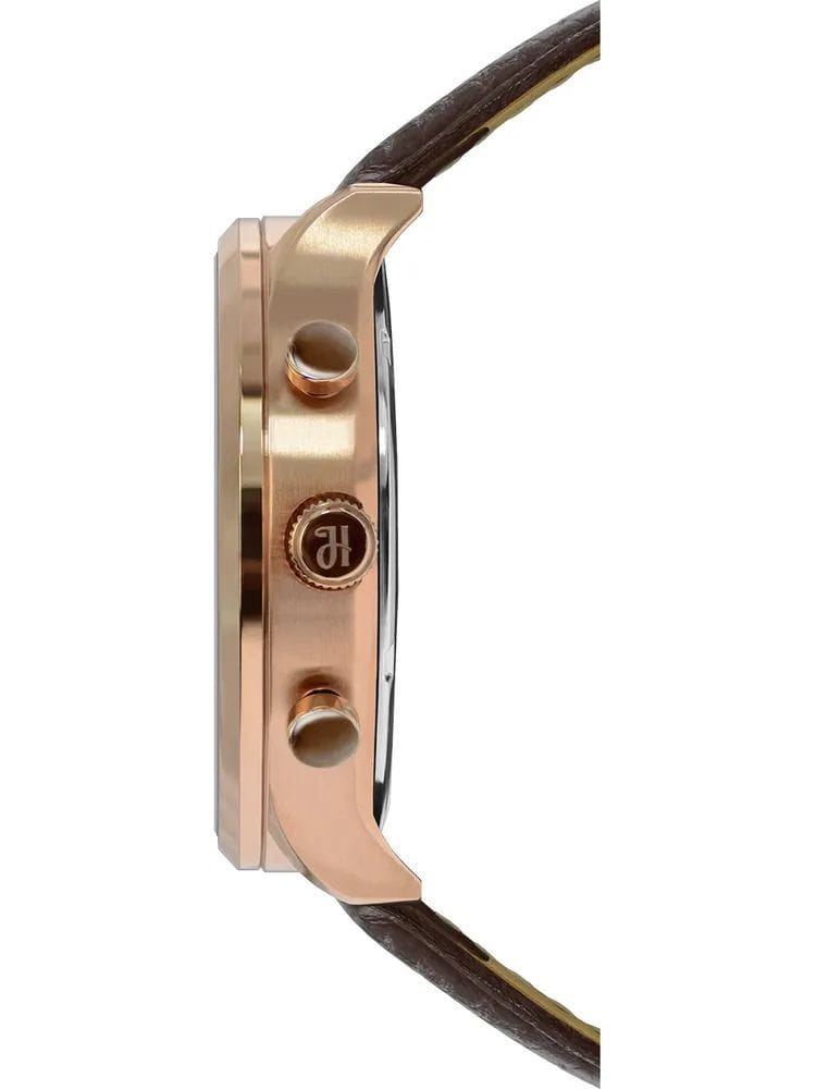 Ремешок выполнен из комбинации кожи и текстиля, обеспечивая комфорт при носке и добавляя модели уникальный внешний вид.  Толщина корпуса составляет 13 мм, что придаёт часам солидный вид.