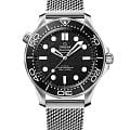 Часы Seamaster Diver 300M, появившиеся в 1993 году, стали настоящей легендой среди ценителей часового искусства. Современная коллекция вобрала в себя знаменитое океанское наследие, привнеся в него самые передовые инновации и дизайнерские решения OMEGA. Модель диаметром 42 мм из нержавеющей стали привлекает внимание черным безелем из оксалатного анодированного алюминия с дайверской шкалой, покрытой белым люминесцентным составом Super-LumiNovaЛюминесцентное покрытиеПозволяет считывать показания времени в темноте. Производители наносят на стрелки, часовые индексы, безель или поверхность циферблата светонакопительный состав, дающий холодное свечение.. Циферблат, также изготовленный из черного алюминия, украшен лазерной гравировкой в виде культового волнообразного узора Diver. Скелетонизированные стрелки и индексы покрыты родием и заполнены белым люминесцентным составом Super-LumiNovaЛюминесцентное покрытиеПозволяет считывать показания времени в темноте. Производители наносят на стрелки, часовые индексы, безель или поверхность циферблата светонакопительный состав, дающий холодное свечение.. Остальные метки, в том числе логотип OMEGA, выполнены в белом цвете переводным способом. Часы дополнены матовым браслетом сетчатого плетения с застежкой и оснащены калибром OMEGA Co-Axial Master Chronometer 8806, который можно рассмотреть сквозь заднюю крышку из сапфирового стеклаСапфировое стеклоПрочный и надёжный материал из кристалла сапфира синтетического происхождения, характеризующийся особой твёрдостью и устойчивостью к царапинам и повреждениям..