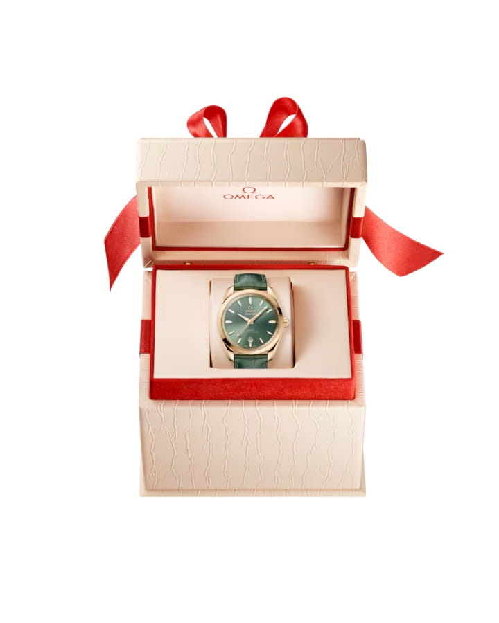 Omega Seamaster Aqua Terra выполнены в симметричном корпусе из полированного 18K Moonshine™ золота с завинчивающейся задней крышкой, украшенной волновым узором. Циферблат дополнен окошком даты на 6 часах, окаймлённым кольцом из 18K Moonshine™ золота. Стрелки и метки выполнены из 18K Moonshine™ золота и оснащены люминесцентным покрытиемЛюминесцентное покрытиеПозволяет считывать показания времени в темноте. Производители наносят на стрелки, часовые индексы, безель или поверхность циферблата светонакопительный состав, дающий холодное свечение. Super-LumiNova для лучшей читаемости в темноте. Индексы выполнены в форме корпусов парусников — деталь, подчёркивающая морское наследие коллекции. Калибр Omega 8801 сертифицирован как Master Chronometer — гарантия высочайшей точности и устойчивости к магнитным полям. Запас хода составляет 55 часов. Защиту циферблата обеспечивает сапфировое стеклоСапфировое стеклоПрочный и надёжный материал из кристалла сапфира синтетического происхождения, характеризующийся особой твёрдостью и устойчивостью к царапинам и повреждениям. с антибликовым покрытиемАнтибликовое покрытиеСлой оксида металла в 0,13-0,3 микрон, благодаря которому стекло часов не бликует и не отражает свет. Антибликовое покрытие уменьшает отражение света в 10 раз, обеспечивая отличную читаемость показателей циферблата. с обеих сторон. Водозащита позволяет использовать часы в воде без риска повреждения. Часы установлены на кожаный ремешок изумрудного цвета. Это сочетание премиального качества, технологичности и классического дизайна.