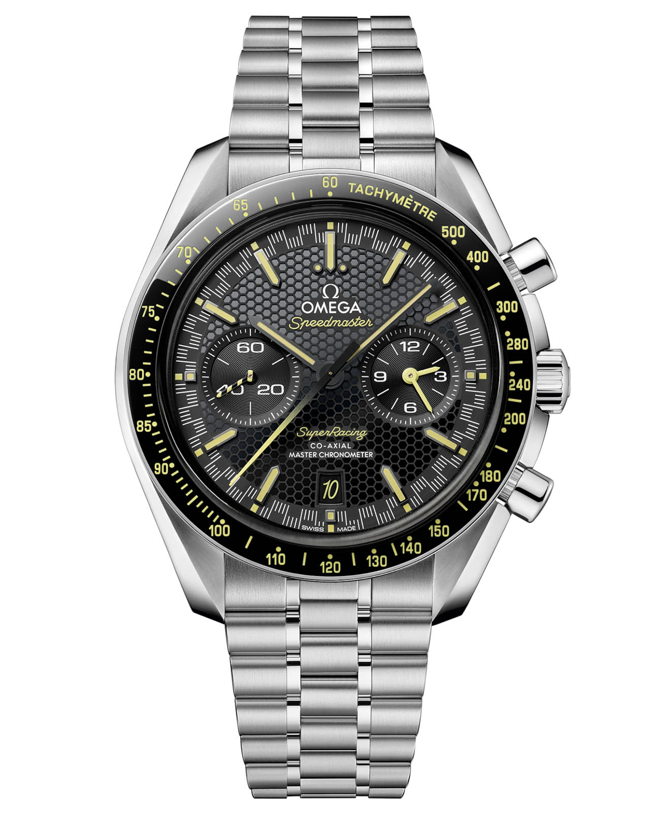 OMEGA Speedmaster 2023 года в 44,25-мм корпусе из нержавеющей стали представляет революционную инновацию - первые в мире часы с системой Spirate™. Многослойный черный циферблат с сотообразным узором и гоночной минутной шкалой обрамлен керамическим безелемБезельВнешний ободок, закрепляющий стекло. В спортивных часах так называется поворотное кольцо с делениями на циферблате, выполняет роль таймера – замеряет отрезки времени на шкале. Неподвижный безель – элемент декора. Однонаправленно вращающийся безель на дайверских часах позволяет фиксировать моменты погружения и выныривания на поверхность., украшенным тахиметрической шкалойТахиметрРазмеченная шкала, располагается на ободке или безеле часов. Тахиметр позволяет рассчитать скорость на определённом участке пути, расстояние измеряется в километрах или милях. из желтой эмали Grand Feu. Желтый градиент стрелки хронографаХронографФункция позволяет измерять отрезки времени с особой точностью: часы, минуты, секунды. Верным признаком хронографа является наличие на циферблате 3 дополнительных окошек-счётчиков. эффектно контрастирует с черно-желтой полосатой малой секундной стрелкой на 9 часах, в то время как на 3 часах расположен 60-минутный и 12-часовой счетчики, а на 6 часах - памятный индикатор даты с цифрой "10" в фирменном стиле. Полированные черные индексы-стрелки с Super-LumiNovaЛюминесцентное покрытиеПозволяет считывать показания времени в темноте. Производители наносят на стрелки, часовые индексы, безель или поверхность циферблата светонакопительный состав, дающий холодное свечение. желтого свечения и соответствующие надписи на циферблате завершают динамичный образ. В основе - революционный калибр OMEGA Co-Axial Master Chronometer 9920 с системой Spirate™, сертифицированный METAS. Комплектация включает фирменный черный футляр с сотообразным узором и желтой строчкой, а также ремень NATOРемешок NATOРемешок NATO — это прочный, универсальный и сменный часовой ремешок, изначально созданный для военных. Он изготовлен из нейлона или другого прочного материала и имеет уникальную конструкцию, которая позволяет часам оставаться на запястье даже в случае поломки одной из прикрепляющих точек. из переработанного нейлона в черно-желтой гамме.