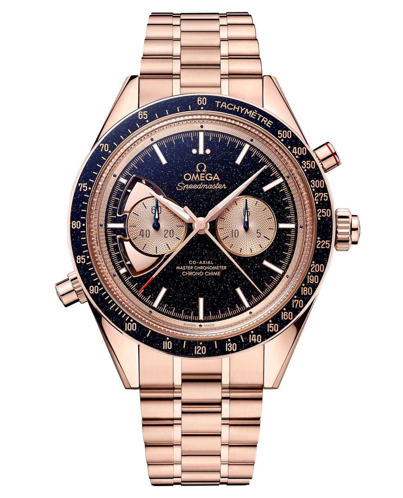 Chrono Chime — вершина часового искусства OMEGA в 45-мм корпусе из 18-каратного золота Sedna™18-каратное золотоОбозначение по каратной системе пробирования, оно показывает, сколько драгоценного металла содержится в изделии. 18 карат - в составе 75% чистого золота, соответствует 750 пробе.