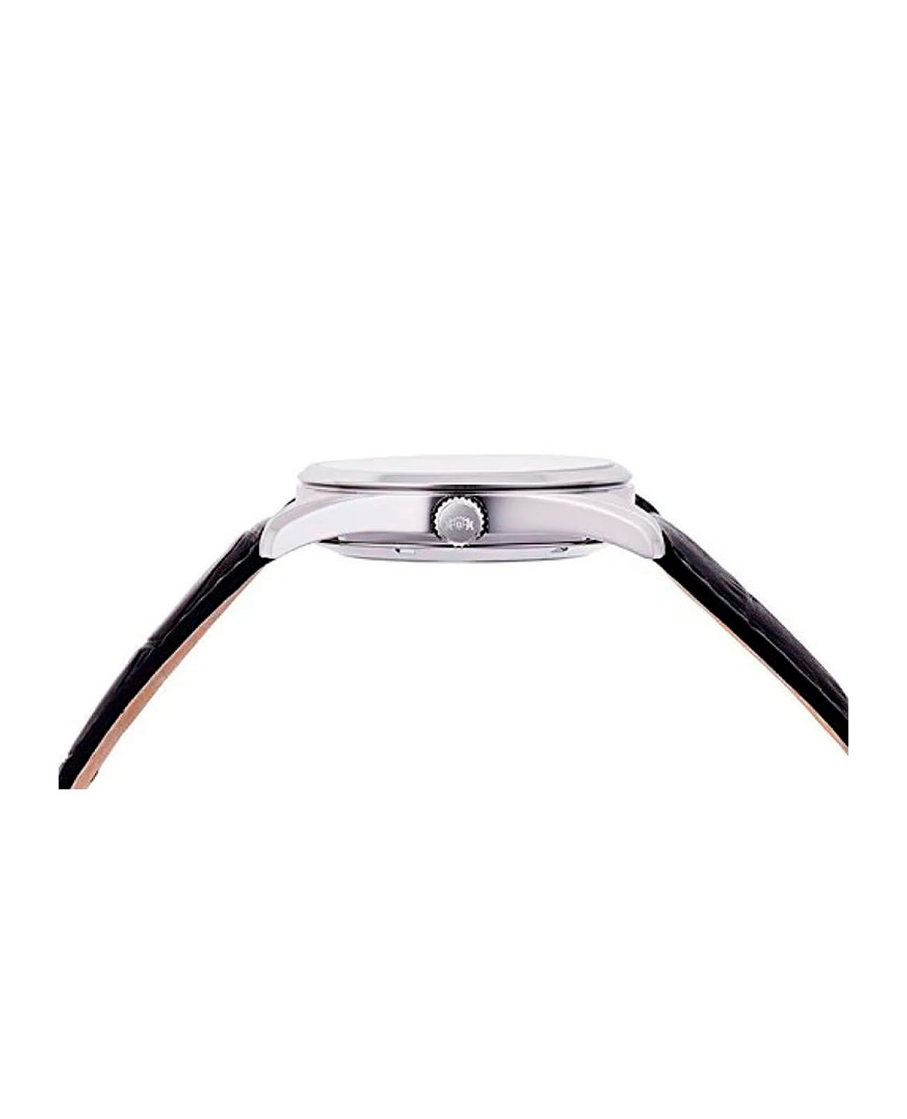 Часы Orient RA-AR0003S представляют собой стильную модель из коллекции Contemporary, сочетающую в себе классический дизайн и современные технологии. Это мужские механические часы с автоподзаводом, оснащённые калибром F6T22, который обеспечивает точность хода в пределах +25/-15 секунд в сутки и запас хода до 40 часов. Часы также поддерживают функцию ручного подзавода и остановки секундной стрелки (hacking stop), что позволяет точно синхронизировать время. Корпус часов выполнен из нержавеющей стали и имеет диаметр 40,8 мм при толщине 10,9 мм. Водонепроницаемость модели составляет 50 метров, что защищает часы от случайных брызг или капель дождя, но не предназначено для плавания или дайвинга. Часы оснащены сапфировым стекломСапфировое стеклоПрочный и надёжный материал из кристалла сапфира синтетического происхождения, характеризующийся особой твёрдостью и устойчивостью к царапинам и повреждениям., устойчивым к царапинам, и винтовой задней крышкой с прозрачным окном, позволяющим наблюдать за работой механизма. Циферблат выполнен в белом цвете с полускелетонным дизайном, который открывает вид на механизм в области 9 часов. На циферблате расположены светящиеся стрелки с люминесцентным покрытиемЛюминесцентное покрытиеПозволяет считывать показания времени в темноте. Производители наносят на стрелки, часовые индексы, безель или поверхность циферблата светонакопительный состав, дающий холодное свечение., обеспечивающие хорошую видимость в темноте. Также предусмотрено окно малой секундной стрелки на позиции 6 часов, что добавляет часам уникальный и стильный вид. Браслет часов изготовлен из чёрной кожи, что придаёт часам классический и элегантный вид. Застёжка выполнена в виде стандартной конструкции.