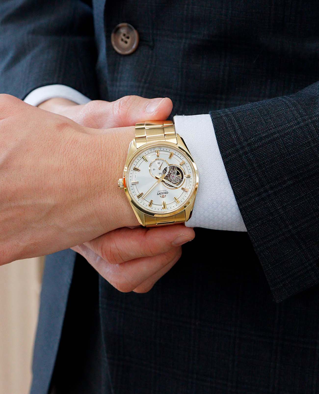 Корпус часов выполнен из нержавеющей стали с PVD-покрытиемPVDУльтратонкое покрытие наносится в технике вакуумного напыления, сочетает в себе нитрид титана особой прочности со слоем золота или оксида хрома. Несёт в себе декоративную или защитную функцию., что придаёт ему дополнительную износостойкость и элегантный внешний вид. Диаметр корпуса составляет 40,8 мм при толщине 10,9 мм. Водонепроницаемость модели достигает 50 метров, что защищает часы от случайных брызг или капель дождя. Часы оснащены сапфировым стекломСапфировое стеклоПрочный и надёжный материал из кристалла сапфира синтетического происхождения, характеризующийся особой твёрдостью и устойчивостью к царапинам и повреждениям., устойчивым к царапинам, и винтовой задней крышкой с прозрачным окном, позволяющим наблюдать за работой механизма.