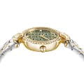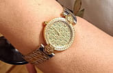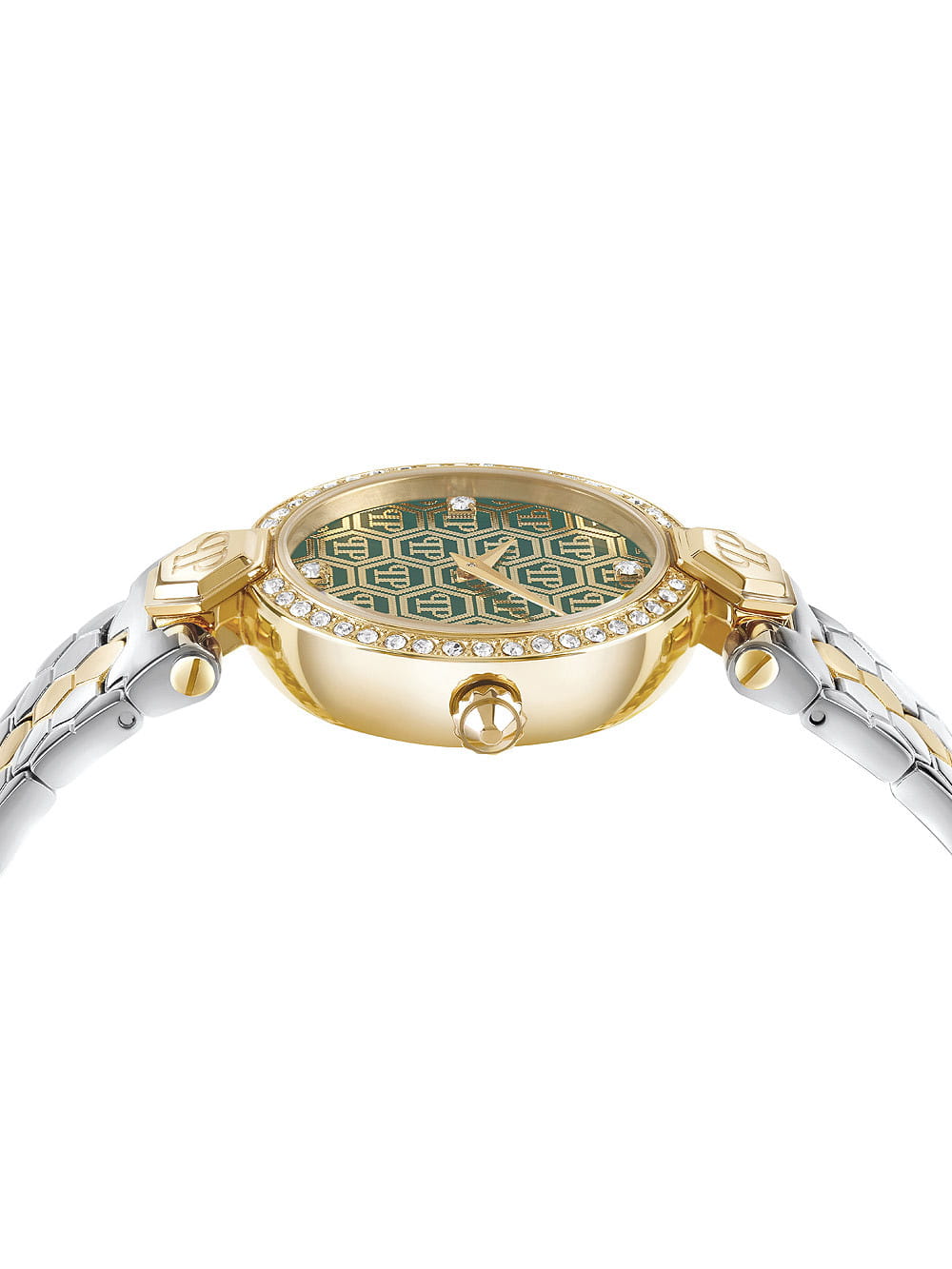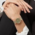 Яркие, классные часы.  Зеленый циферблат с логотипом бренда украшен кристаллами Swarovski.Круглый корпус выполнен из нержавеющей стали с частичным IP покрытием цвета желтого золота и декорирован кристаллами по безелю. Прочное минеральное стекло устойчивое к мелким механическим повреждениям.