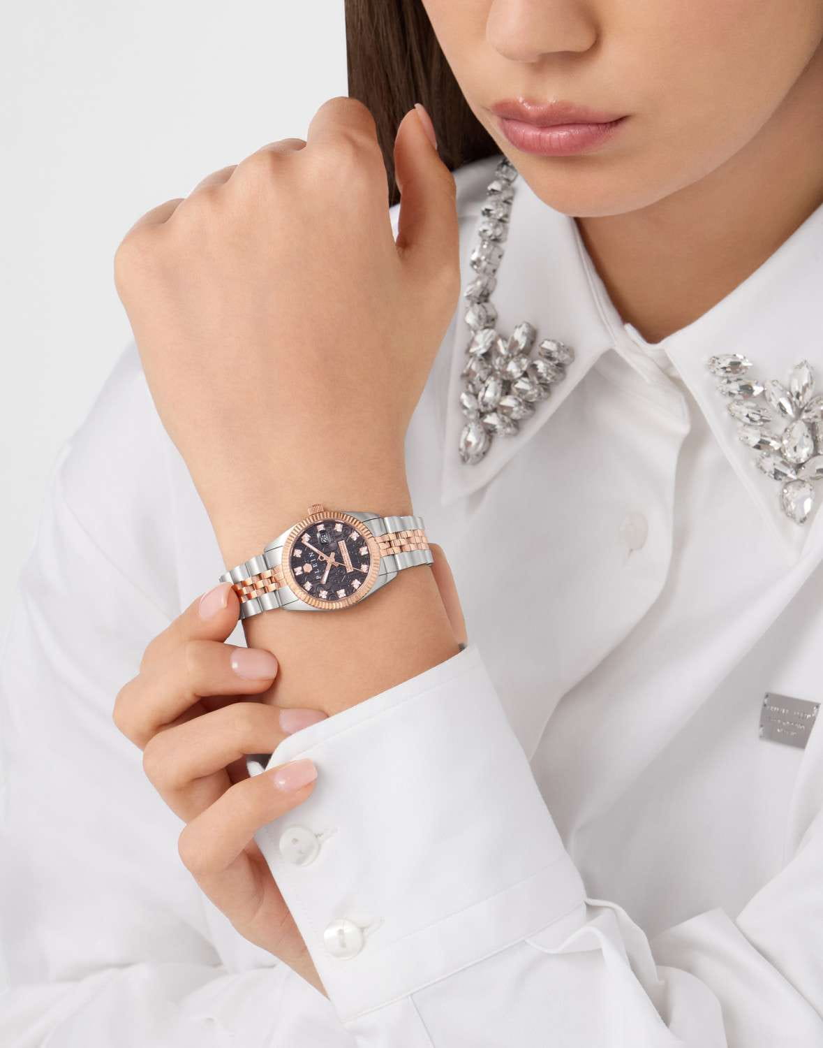 Philipp Plein DATE SUPERLATIVE PWNFA0625 - дерзкое заявление любви к роскоши и бунтарскому стилю. Диаметр круглого корпуса из прочной нержавеющей стали равен 28 мм. Стальной браслет на застёжке «бабочка» с кнопкамиЗастёжка "бабочка"Такой вид застёжки дополняется предохранителями, помогающими избежать случайного раскрытия браслета. Обладают изящным исполнением. обеспечивает надёжную фиксацию и комфортное ношение. Метки в виде кристаллов Preciosa. Минеральное стеклоМинеральное стеклоМинеральное стекло представляет собой искусственно выращенный минерал кварца. Такое стекло отличается особой устойчивостью к повреждениям и царапинам. Уступает по некоторым качествам сапфировому стеклу. защищает циферблат от царапин. Люминесцентное покрытиеЛюминесцентное покрытиеПозволяет считывать показания времени в темноте. Производители наносят на стрелки, часовые индексы, безель или поверхность циферблата светонакопительный состав, дающий холодное свечение. стрелок и меток позволит следить за временем даже в полной темноте. БезельБезельВнешний ободок, закрепляющий стекло. В спортивных часах так называется поворотное кольцо с делениями на циферблате, выполняет роль таймера – замеряет отрезки времени на шкале. Неподвижный безель – элемент декора. Однонаправленно вращающийся безель на дайверских часах позволяет фиксировать моменты погружения и выныривания на поверхность. с PVD-покрытиемPVDУльтратонкое покрытие наносится в технике вакуумного напыления, сочетает в себе нитрид титана особой прочности со слоем золота или оксида хрома. Несёт в себе декоративную или защитную функцию.. Граненая заводная головка. Влагозащита: 50 метров, позволит защитить корпус от случайных брызг или капель дождя. Идеальный аксессуар для тех, кто ценит индивидуальность и не боится выделяться из толпы.