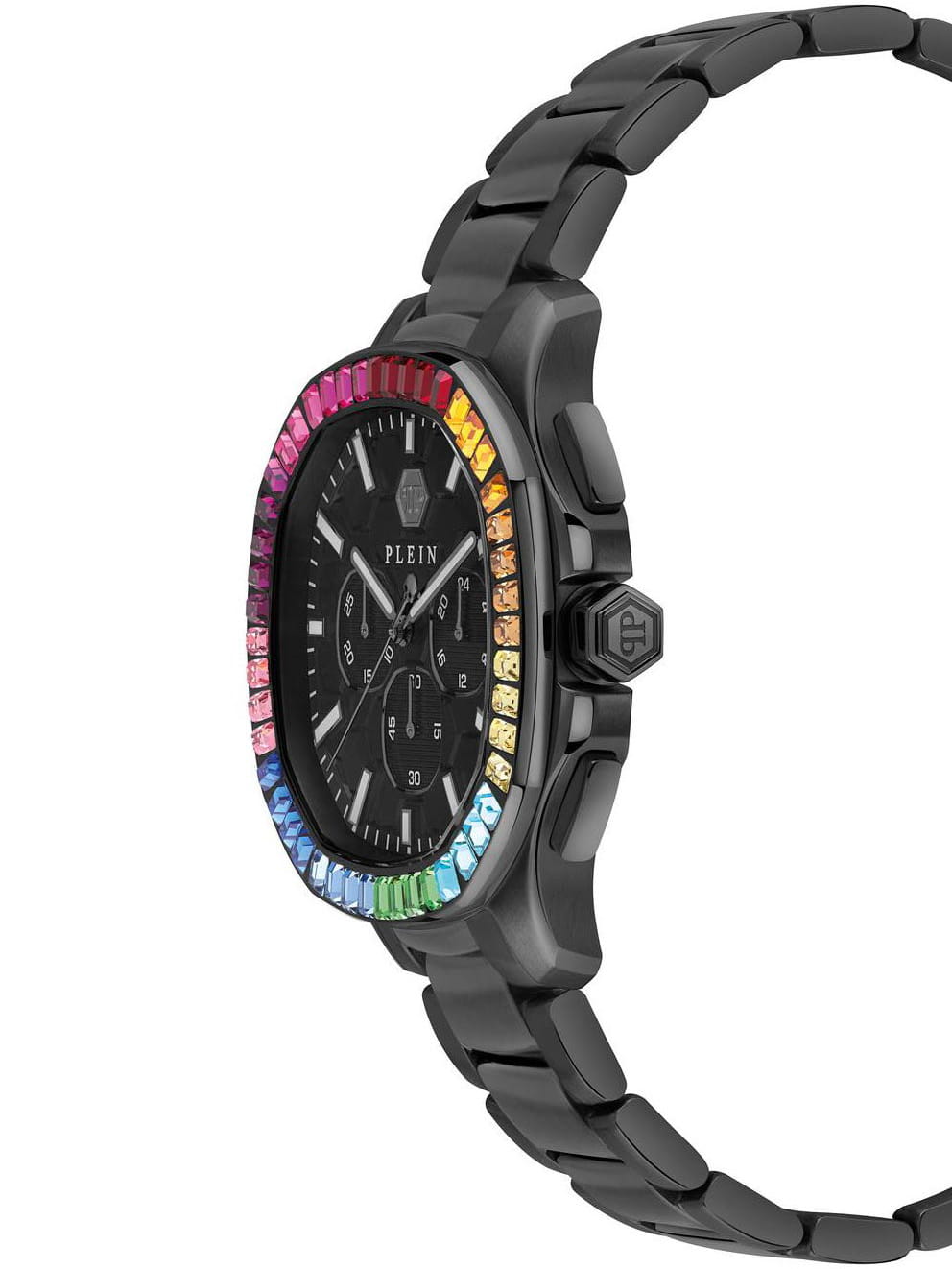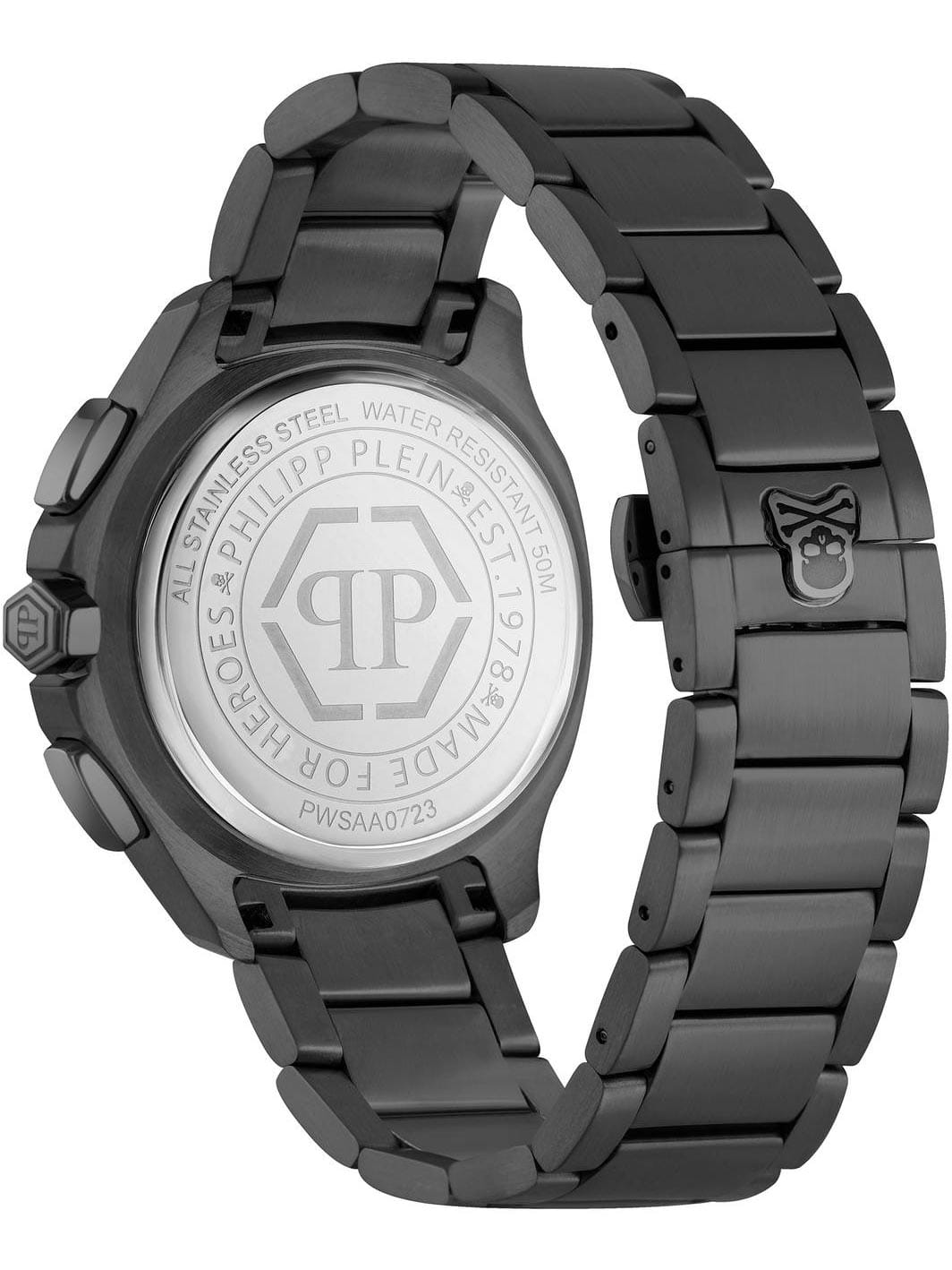 Яркие мужские часы-хронографХронографФункция позволяет измерять отрезки времени с особой точностью: часы, минуты, секунды. Верным признаком хронографа является наличие на циферблате 3 дополнительных окошек-счётчиков. с секундомеромСекундомерСекундоме́р — прибор, способный измерять интервалы времени с точностью до долей секунды.  Philipp Plein PWSAA0723, кварцевый механизм с высокой точностью. Класс водозащиты: 50 метров, позволит защитить корпус от случайных брызг или капель дождя. Корпус часов изготовлен из стали с IP-покрытиемIP-покрытиеМетод ионного напыления. Демонстрирует повышенную устойчивость к истиранию, окислению и химическим веществам. Под воздействием высокого давления и температуры около 1500°C молекулы металла надёжно соединяются с частицами корпуса часов.. Стрелки и метки с люминесцентным покрытиемЛюминесцентное покрытиеПозволяет считывать показания времени в темноте. Производители наносят на стрелки, часовые индексы, безель или поверхность циферблата светонакопительный состав, дающий холодное свечение.. Застёжка бабочка с кнопкамиЗастёжка "бабочка"Такой вид застёжки дополняется предохранителями, помогающими избежать случайного раскрытия браслета. Обладают изящным исполнением.