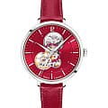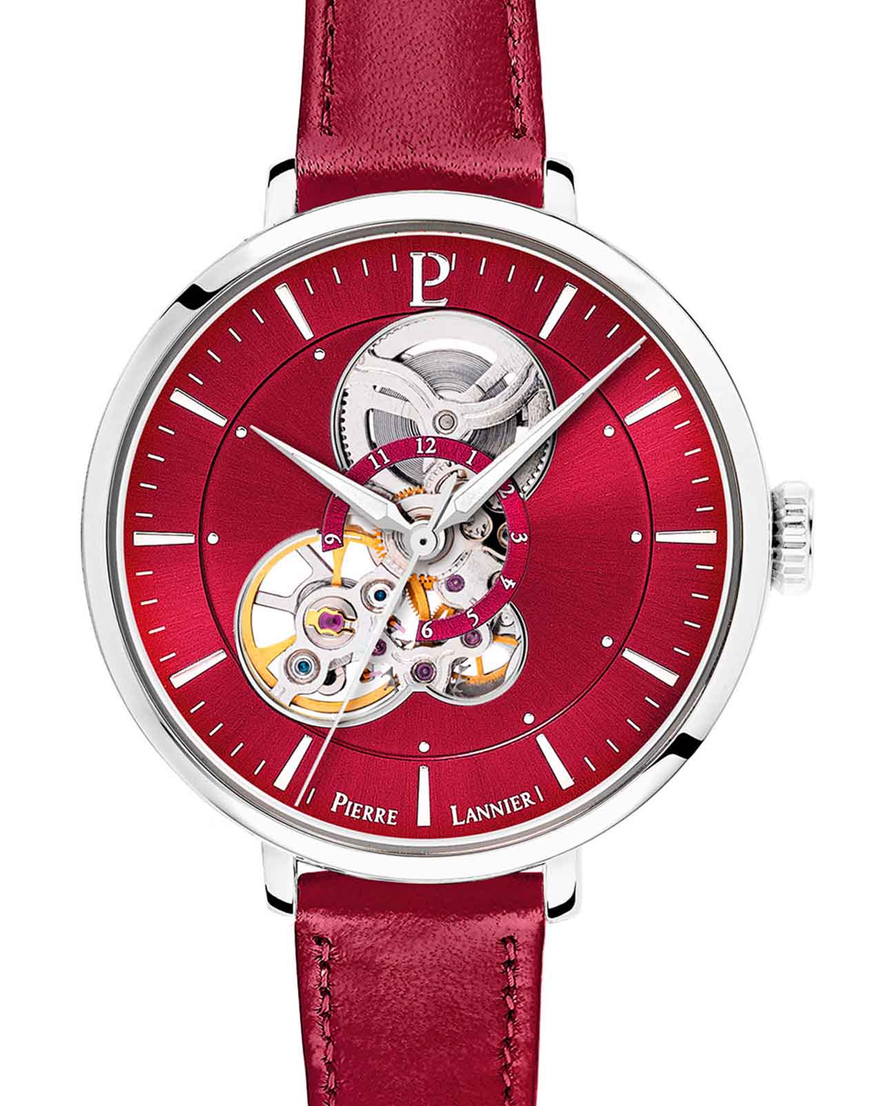 Женские механические часы с автоподзаводом Pierre Lannier Melodie 348A655. Минеральное стеклоМинеральное стеклоМинеральное стекло представляет собой искусственно выращенный минерал кварца. Такое стекло отличается особой устойчивостью к повреждениям и царапинам. Уступает по некоторым качествам сапфировому стеклу. устойчивое к мелким механическим повреждениям. Корпус выполнен из нержавеющей стали. Центральные часовая, минутная и секундная стрелки. Красный скелетонизированный циферблат. Стрелки с люминесцентным покрытиемЛюминесцентное покрытиеПозволяет считывать показания времени в темноте. Производители наносят на стрелки, часовые индексы, безель или поверхность циферблата светонакопительный состав, дающий холодное свечение.. Класс водозащиты: 30 метров, позволит защитить корпус от случайных брызг или капель дождя. Кожаный ремешок на стандартной застёжке.