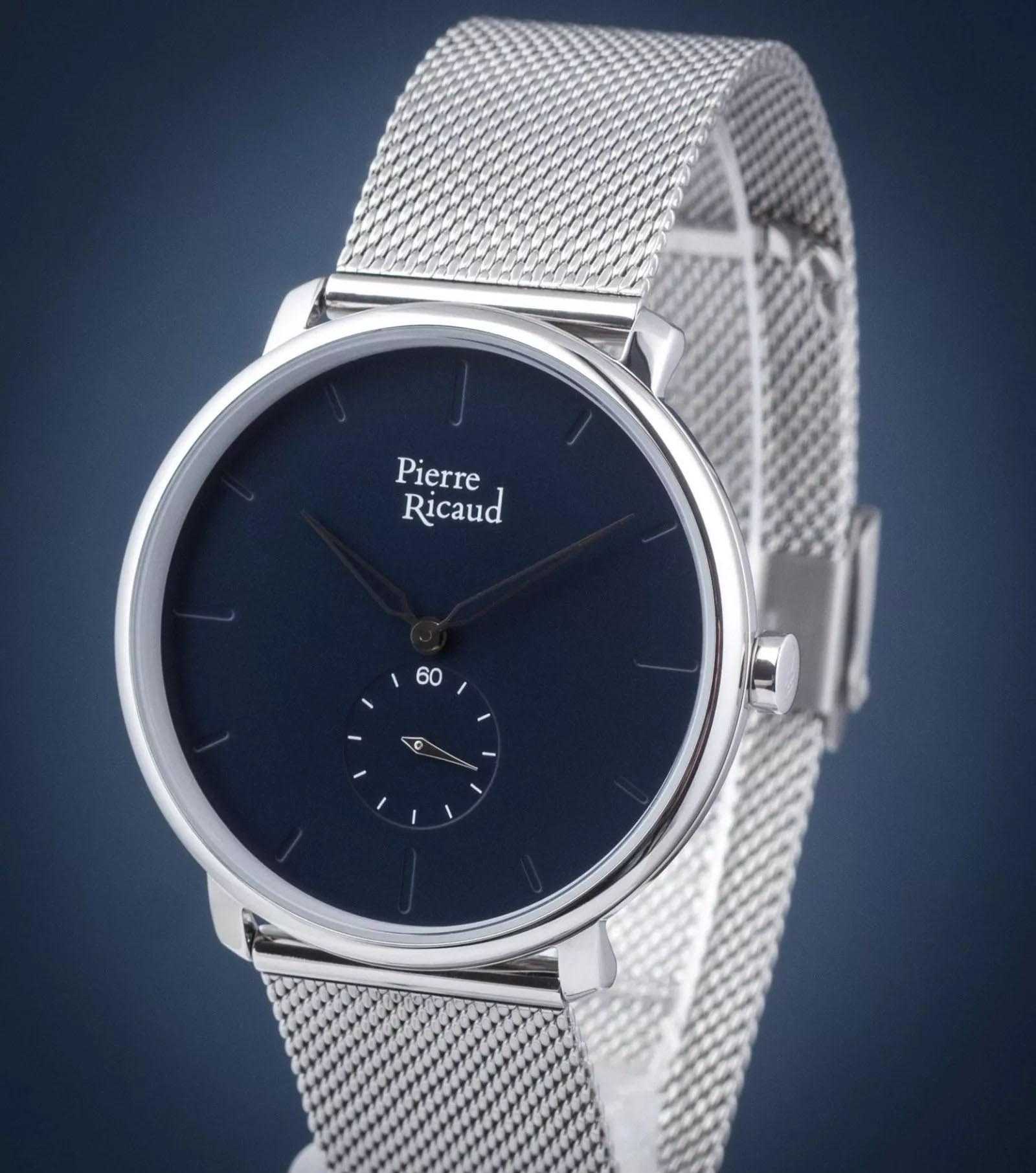 Мужские часы с минеральным стекломМинеральное стеклоМинеральное стекло представляет собой искусственно выращенный минерал кварца. Такое стекло отличается особой устойчивостью к повреждениям и царапинам. Уступает по некоторым качествам сапфировому стеклу. Pierre Ricaud P97168.5115Q, кварцевый механизм с высокой точностью. Класс водозащиты: 30 метров, позволит защитить корпус от случайных брызг или капель дождя. Корпус часов изготовлен из стали. Стальной браслет на раскладной застёжкеРаскладная застёжкаТакой тип застёжки используется только на браслетах из металла. Она никогда не раскрывается полностью, происходит разделение на 2 и более частей. Раскладывающая застёжка снизит вероятность потери часов к минимуму.. Вынесенная секундная стрелка.