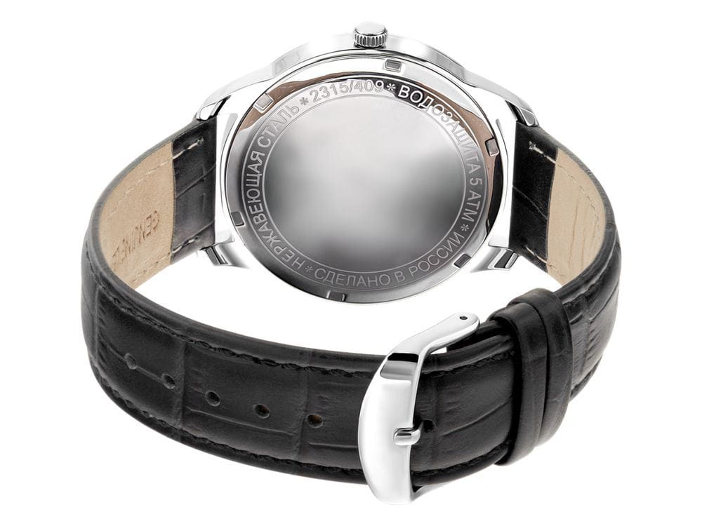 Poljot 2315.581201 — элегантные кварцевые мужские часы, объединяющие лаконичный дизайн и повседневную универсальность. Корпус из нержавеющей стали подчёркивает строгость линий и сдержанную эстетику, а глубокий циферблат с аккуратным гильоше и арабскими цифрами создаёт гармоничное визуальное равновесие. Тонкие серебристые стрелки с люминесцентным покрытиемЛюминесцентное покрытиеПозволяет считывать показания времени в темноте. Производители наносят на стрелки, часовые индексы, безель или поверхность циферблата светонакопительный состав, дающий холодное свечение. обеспечивают лёгкость восприятия времени, а окно даты на позиции «3 часа» добавляет практичности. Прочное минеральное стеклоМинеральное стеклоМинеральное стекло представляет собой искусственно выращенный минерал кварца. Такое стекло отличается особой устойчивостью к повреждениям и царапинам. Уступает по некоторым качествам сапфировому стеклу. защищает циферблат от мелких повреждений, а ремешок из натуральной кожи с фактурой крокодила обеспечивает комфорт и элегантное прилегание к запястью. Poljot — это часы для мужчин, ценящих точность, простоту и утончённый повседневный стиль.