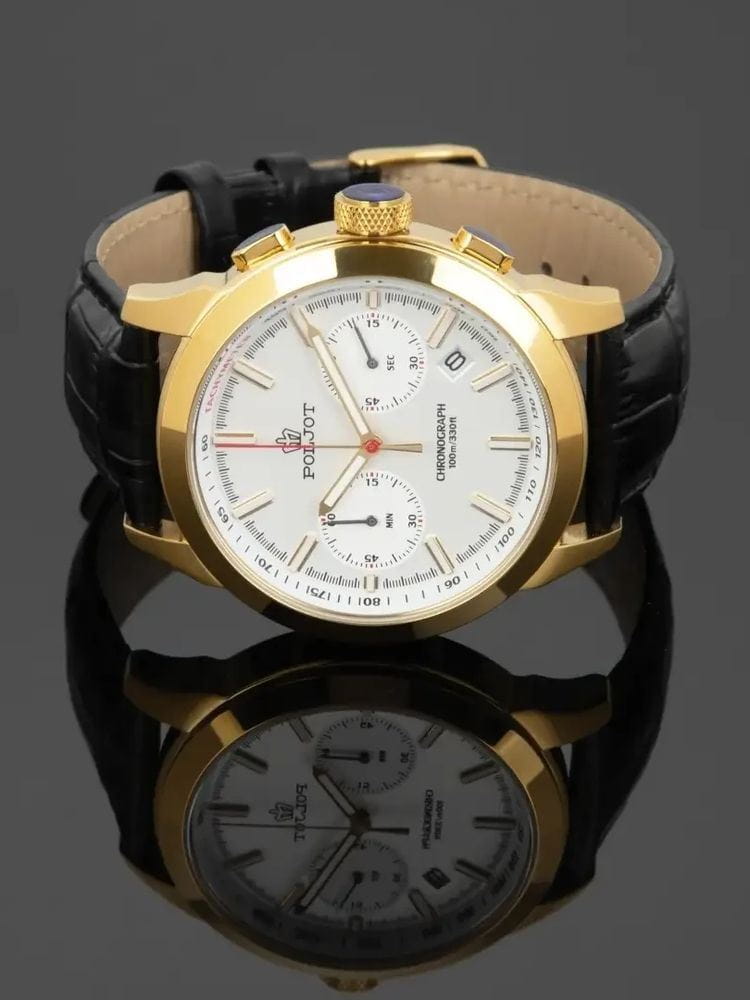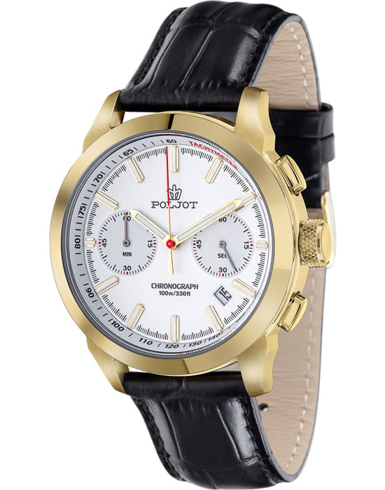 Poljot 6S21.746033 — классические мужские часы, в которых традиции российского часового мастерства сочетаются с современным дизайном. Корпус из нержавеющей стали с PVD-покрытиемPVDУльтратонкое покрытие наносится в технике вакуумного напыления, сочетает в себе нитрид титана особой прочности со слоем золота или оксида хрома. Несёт в себе декоративную или защитную функцию. подчёркивает солидность и надёжность модели, а насыщенный циферблат с лучевой текстурой придаёт образу выразительность и глубину. Два дополнительных счётчика хронографаХронографФункция позволяет измерять отрезки времени с особой точностью: часы, минуты, секунды. Верным признаком хронографа является наличие на циферблате 3 дополнительных окошек-счётчиков. обеспечивают точное измерение интервалов времени, дополняя функциональность часов. Контрастные стрелки и метки с люминесцентным покрытиемЛюминесцентное покрытиеПозволяет считывать показания времени в темноте. Производители наносят на стрелки, часовые индексы, безель или поверхность циферблата светонакопительный состав, дающий холодное свечение. обеспечивают отличную читаемость даже в условиях слабого освещения. Прочное минеральное стеклоМинеральное стеклоМинеральное стекло представляет собой искусственно выращенный минерал кварца. Такое стекло отличается особой устойчивостью к повреждениям и царапинам. Уступает по некоторым качествам сапфировому стеклу. защищает циферблат от царапин, а ремешок из натуральной кожи с классической пряжкой гарантирует комфорт и элегантную посадку на запястье. Poljot — это надёжный спутник современного мужчины, объединяющий точность, стиль и характер.
