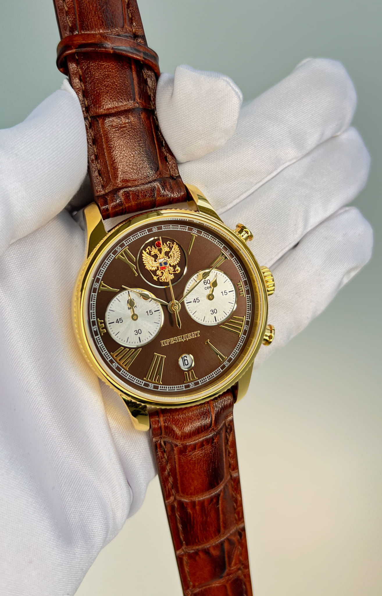 Часы «Президент» модели 3526416 — это мужские кварцевые наручные часы с хронографом, выпущенные ограниченным тиражом в 100 экземпляров. Механизм: японский кварцевый хронограф Miyota 6S21, обеспечивающий высокую точность. Функции: часы, минуты, секунды, дата, хронограф (секундомер). Корпус: из нержавеющей стали с PVD-покрытиемPVDУльтратонкое покрытие наносится в технике вакуумного напыления, сочетает в себе нитрид титана особой прочности со слоем золота или оксида хрома. Несёт в себе декоративную или защитную функцию. цвета жёлтого золота, диаметром 41,8 мм, толщиной 11,4 мм. Циферблат: чёрный с римскими цифрами и изображением государственного герба, подчёркивающий элегантный стиль. Стекло: сапфировое стеклоСапфировое стеклоПрочный и надёжный материал из кристалла сапфира синтетического происхождения, характеризующийся особой твёрдостью и устойчивостью к царапинам и повреждениям. с антибликовым покрытием, устойчивое к царапинам. Водонепроницаемость: 5 ATM (50 метров), что делает часы подходящими для повседневного использования. Ремешок: из натуральной кожи коричневого цвета, шириной 20 мм, с классической застёжкой. Эти часы — идеальный выбор для ценителей стиля и ограниченных коллекций.