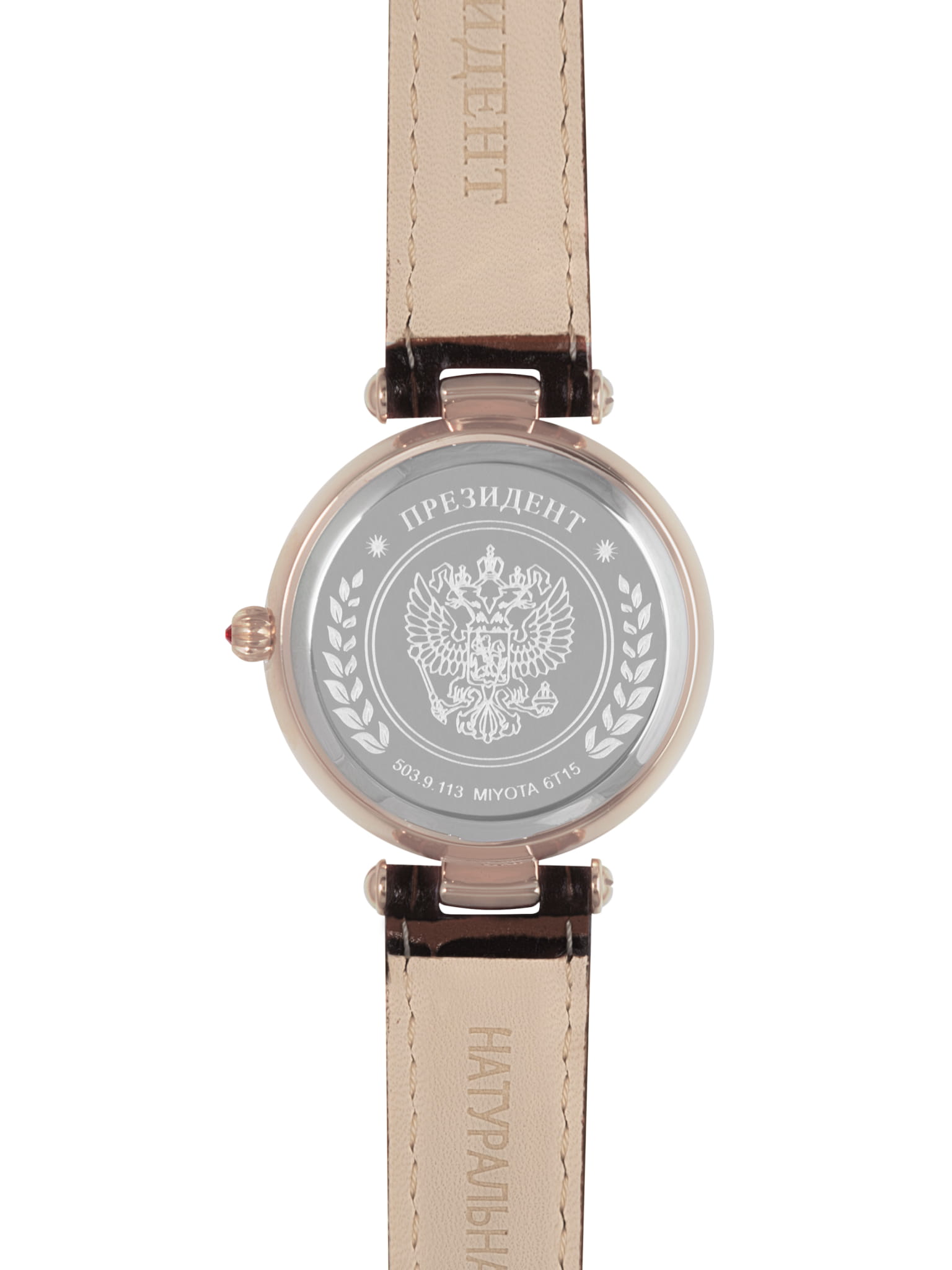 Часы «Президент» модели 5039113 — это женские механические наручные часы с автоподзаводом, сочетающие элегантный дизайн и надёжность. Механизм: японский механизм Miyota 6T15 с автоподзаводом, обеспечивающий точность и долговечность. Функции: часы, минуты, секунды, дата. Корпус: из нержавеющей стали с покрытием розового золотаPVDУльтратонкое покрытие наносится в технике вакуумного напыления, сочетает в себе нитрид титана особой прочности со слоем золота или оксида хрома. Несёт в себе декоративную или защитную функцию., диаметром 30 мм и толщиной 10 мм. Циферблат: перламутровый с римскими цифрами и кристаллами , подчёркивающий утончённость модели. Стекло: минеральноеМинеральное стеклоМинеральное стекло представляет собой искусственно выращенный минерал кварца. Такое стекло отличается особой устойчивостью к повреждениям и царапинам. Уступает по некоторым качествам сапфировому стеклу., устойчивое к царапинам. Водонепроницаемость: 3 ATM (30 метров), защищает от случайных брызг и дождя. Ремешок: кожаный, шириной 14 мм, обеспечивающий комфорт при ношении. Эти часы идеально подойдут для женщин, ценящих сочетание классического стиля и современных технологий.