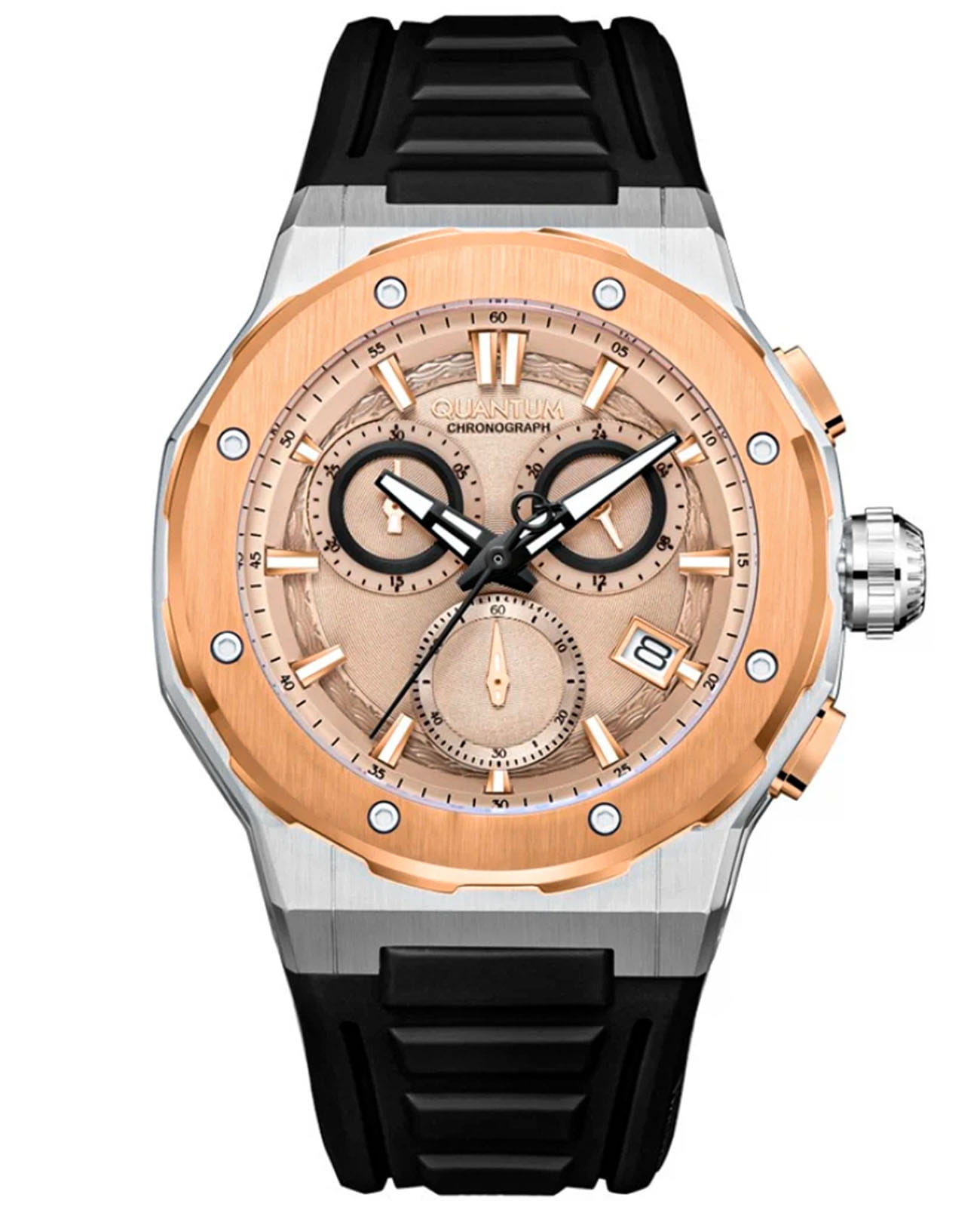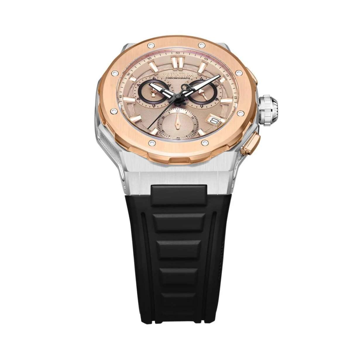 Мужские кварцевые часы Quantum HNG1082.571 из коллекции Hunter — круглый корпус размером 46 мм из нержавеющей стали. БезельБезельВнешний ободок, закрепляющий стекло. В спортивных часах так называется поворотное кольцо с делениями на циферблате, выполняет роль таймера – замеряет отрезки времени на шкале. Неподвижный безель – элемент декора. Однонаправленно вращающийся безель на дайверских часах позволяет фиксировать моменты погружения и выныривания на поверхность. с PVD-покрытиемPVDУльтратонкое покрытие наносится в технике вакуумного напыления, сочетает в себе нитрид титана особой прочности со слоем золота или оксида хрома. Несёт в себе декоративную или защитную функцию. и функциями хронографаХронографФункция позволяет измерять отрезки времени с особой точностью: часы, минуты, секунды. Верным признаком хронографа является наличие на циферблате 3 дополнительных окошек-счётчиков. и окошка даты. Стекло — минеральноеМинеральное стеклоМинеральное стекло представляет собой искусственно выращенный минерал кварца. Такое стекло отличается особой устойчивостью к повреждениям и царапинам. Уступает по некоторым качествам сапфировому стеклу. с антибликовым покрытием. Стрелки с люминесцентным покрытиемЛюминесцентное покрытиеПозволяет считывать показания времени в темноте. Производители наносят на стрелки, часовые индексы, безель или поверхность циферблата светонакопительный состав, дающий холодное свечение.. Механизм — японский кварцевый Seiko. Водонепроницаемость 100 м. Ремешок — чёрный силиконовый на стандартной застёжке. Идеальный выбор для тех, кто ценит турецкий дизайн и спортивно-повседневный стиль.