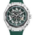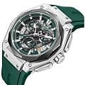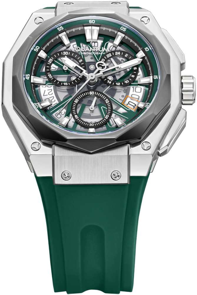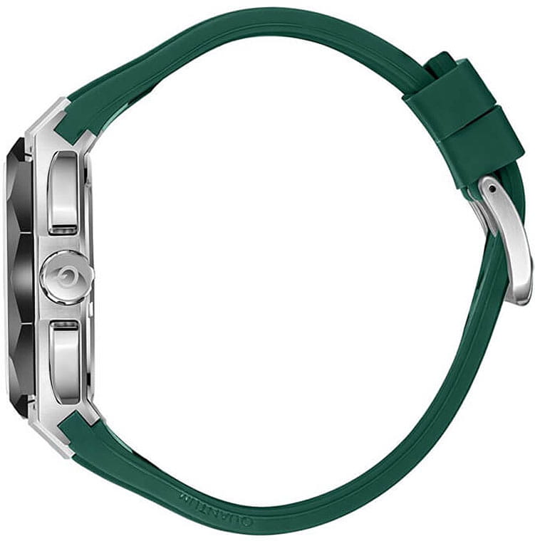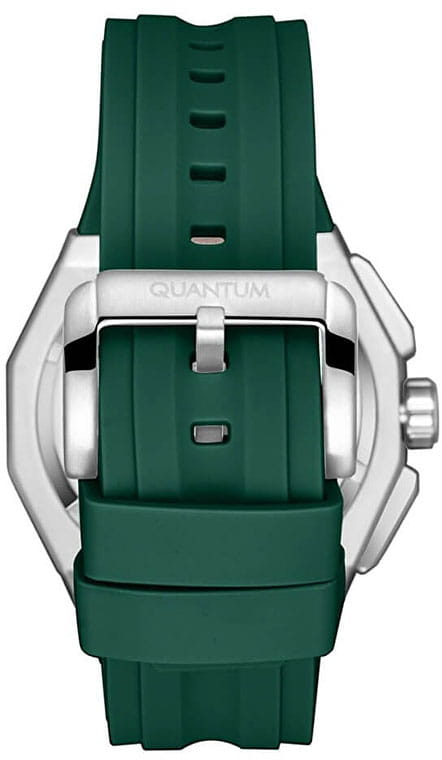 Мужские кварцевые часы Quantum HNG1097.356 из коллекции Hunter — круглый корпус размером 47 мм из нержавеющей стали, оснащённый функциями хронографаХронографФункция позволяет измерять отрезки времени с особой точностью: часы, минуты, секунды. Верным признаком хронографа является наличие на циферблате 3 дополнительных окошек-счётчиков. и окошком даты. БезельБезельВнешний ободок, закрепляющий стекло. В спортивных часах так называется поворотное кольцо с делениями на циферблате, выполняет роль таймера – замеряет отрезки времени на шкале. Неподвижный безель – элемент декора. Однонаправленно вращающийся безель на дайверских часах позволяет фиксировать моменты погружения и выныривания на поверхность. из нержавеющей стали с PVD-покрытиемPVDУльтратонкое покрытие наносится в технике вакуумного напыления, сочетает в себе нитрид титана особой прочности со слоем золота или оксида хрома. Несёт в себе декоративную или защитную функцию.. Стекло — минеральноеМинеральное стеклоМинеральное стекло представляет собой искусственно выращенный минерал кварца. Такое стекло отличается особой устойчивостью к повреждениям и царапинам. Уступает по некоторым качествам сапфировому стеклу. с антибликовым покрытием. Стрелки и метки с люминесцентным покрытиемЛюминесцентное покрытиеПозволяет считывать показания времени в темноте. Производители наносят на стрелки, часовые индексы, безель или поверхность циферблата светонакопительный состав, дающий холодное свечение.. Механизм — японский кварцевый Seiko. Водонепроницаемость 100 м. Ремешок — зелёный силиконовый на стандартной застёжке. Идеальный выбор для тех, кто ценит турецкий дизайн и функциональный спортивный стиль.
