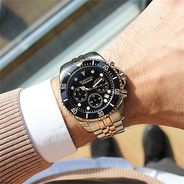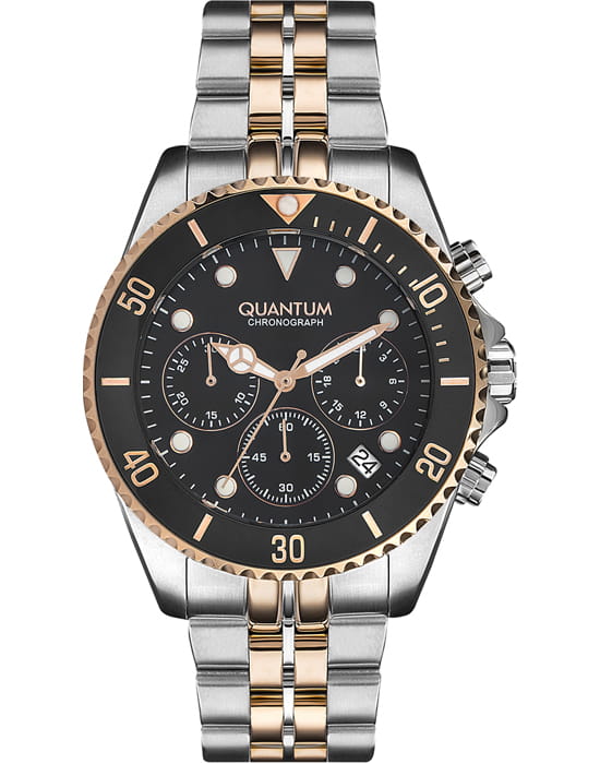 Мужские часы c хронографомХронографФункция позволяет измерять отрезки времени с особой точностью: часы, минуты, секунды. Верным признаком хронографа является наличие на циферблате 3 дополнительных окошек-счётчиков. Quantum PWG930.550, кварцевый механизм с высокой точностью. Минеральное стеклоМинеральное стеклоМинеральное стекло представляет собой искусственно выращенный минерал кварца. Такое стекло отличается особой устойчивостью к повреждениям и царапинам. Уступает по некоторым качествам сапфировому стеклу. устойчивое к появлению царапин, обладающее высокой прозрачностью. Класс водозащиты: 50 метров, позволит защитить корпус от случайных брызг или капель дождя. Корпус часов изготовлен из нержавеющей стали. Стрелки и метки с люминесцентным покрытиемЛюминесцентное покрытиеПозволяет считывать показания времени в темноте. Производители наносят на стрелки, часовые индексы, безель или поверхность циферблата светонакопительный состав, дающий холодное свечение.. Стальной браслет с IP-покрытиемIP-покрытиеМетод ионного напыления. Демонстрирует повышенную устойчивость к истиранию, окислению и химическим веществам. Под воздействием высокого давления и температуры около 1500°C молекулы металла надёжно соединяются с частицами корпуса часов. на раскладной застёжкеРаскладная застёжкаТакой тип застёжки используется только на браслетах из металла. Она никогда не раскрывается полностью, происходит разделение на 2 и более частей. Раскладывающая застёжка снизит вероятность потери часов к минимуму..