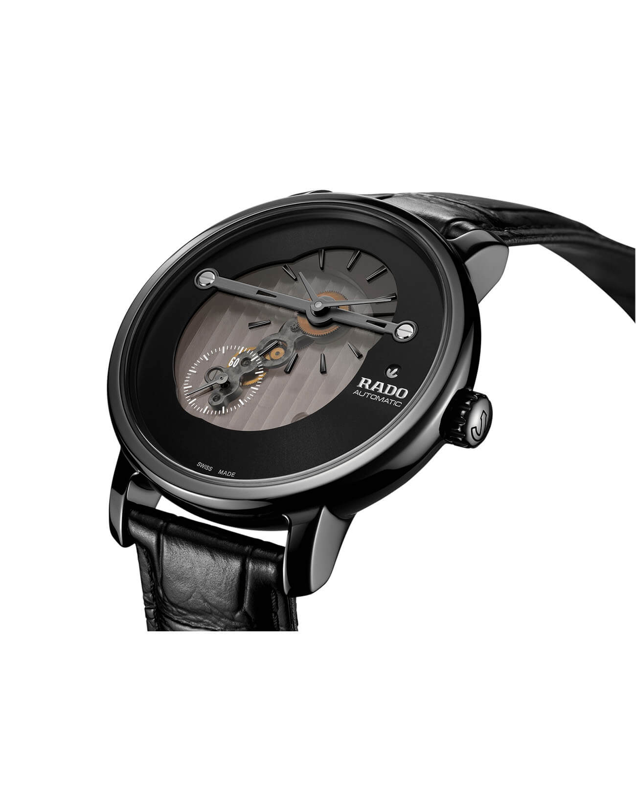 Оригинальный циферблат называют совершенством линий и лаконичности, необычное исполнение которого никого не оставляет равнодушным. Индикация времени занимает не всё пространство, секундный счётчик вынесен отдельно, серединка оставлена прозрачной. Наручные часы оснащаются автоматическим механизмом ETA 2899-S2 с запасом хода 42 часа, украшенным традиционным узором «женевские волны». Скелетонизированная задняя крышка. Антибликовое покрытие сапфирового стекла. Корпус и безельБезельВнешний ободок, закрепляющий стекло. В спортивных часах так называется поворотное кольцо с делениями на циферблате, выполняет роль таймера – замеряет отрезки времени на шкале. Неподвижный безель – элемент декора. Однонаправленно вращающийся безель на дайверских часах позволяет фиксировать моменты погружения и выныривания на поверхность. из высокотехнологичной керамикиВысокотехнологичная керамикаИнновационный запатентованный Rado материал с гладкой или матовой поверхностью. Керамика за счёт кристаллической структуры обладает повышенной устойчивостью от возникновения царапин. Материал способен принимать температуру тела человека, обеспечивая невероятный комфорт при ношении.. Ремешок из натуральной кожи. Апертура даты. Диаметр корпуса: 43 мм.