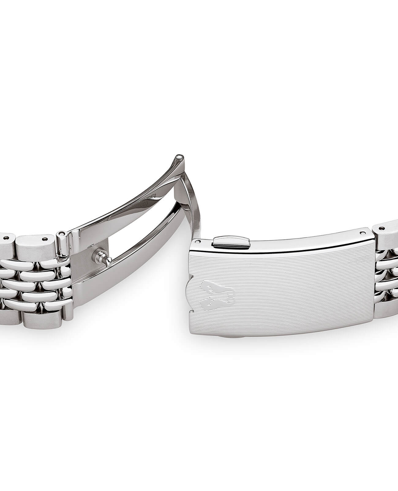 Модель относится к премиальному сегменту, стильно смотрится синий узорчатый циферблат с контрастными элементами. Нижняя часть дополнена эмблемой в виде морских коньков, в верхней находится узнаваемый логотип Rado. Часы сделаны из нержавеющей стали 316L, как и первые аксессуары из линейки Golden Horse, отличием стал безельБезельВнешний ободок, закрепляющий стекло. В спортивных часах так называется поворотное кольцо с делениями на циферблате, выполняет роль таймера – замеряет отрезки времени на шкале. Неподвижный безель – элемент декора. Однонаправленно вращающийся безель на дайверских часах позволяет фиксировать моменты погружения и выныривания на поверхность. из плазменной керамикиВысокотехнологичная плазменная керамикаИнновационный материал, технология запатентована. Выплавление керамики осуществляется в печи при 20 000 °C, белоснежный материал под воздействием ультравысокой температуры приобретает уникальный блеск, присущий металлам.. Корпус защищает автоматический калибр ETA C07.611 с резервом хода 80 часов от ударов и повреждений. Задняя крышка прозрачная. Сапфировое стекло с обработкой «антиблик». Водостойкость до 5 бар. Отображение текущего числа. Диаметр корпуса: 41,8 мм.